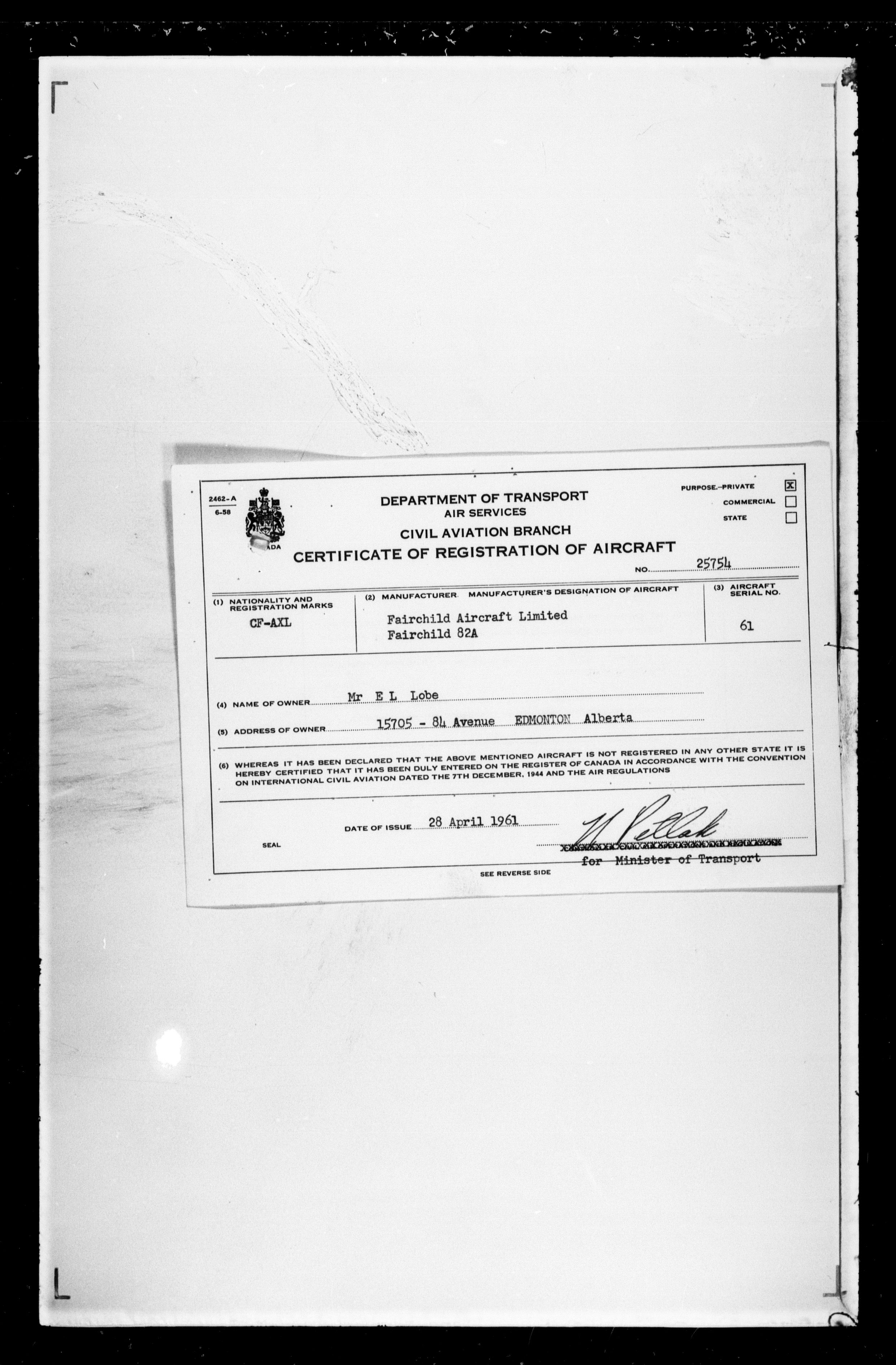 Department of Transport : Civil aircraft registration, inspection and operation files, 1920-1986 : T-7445