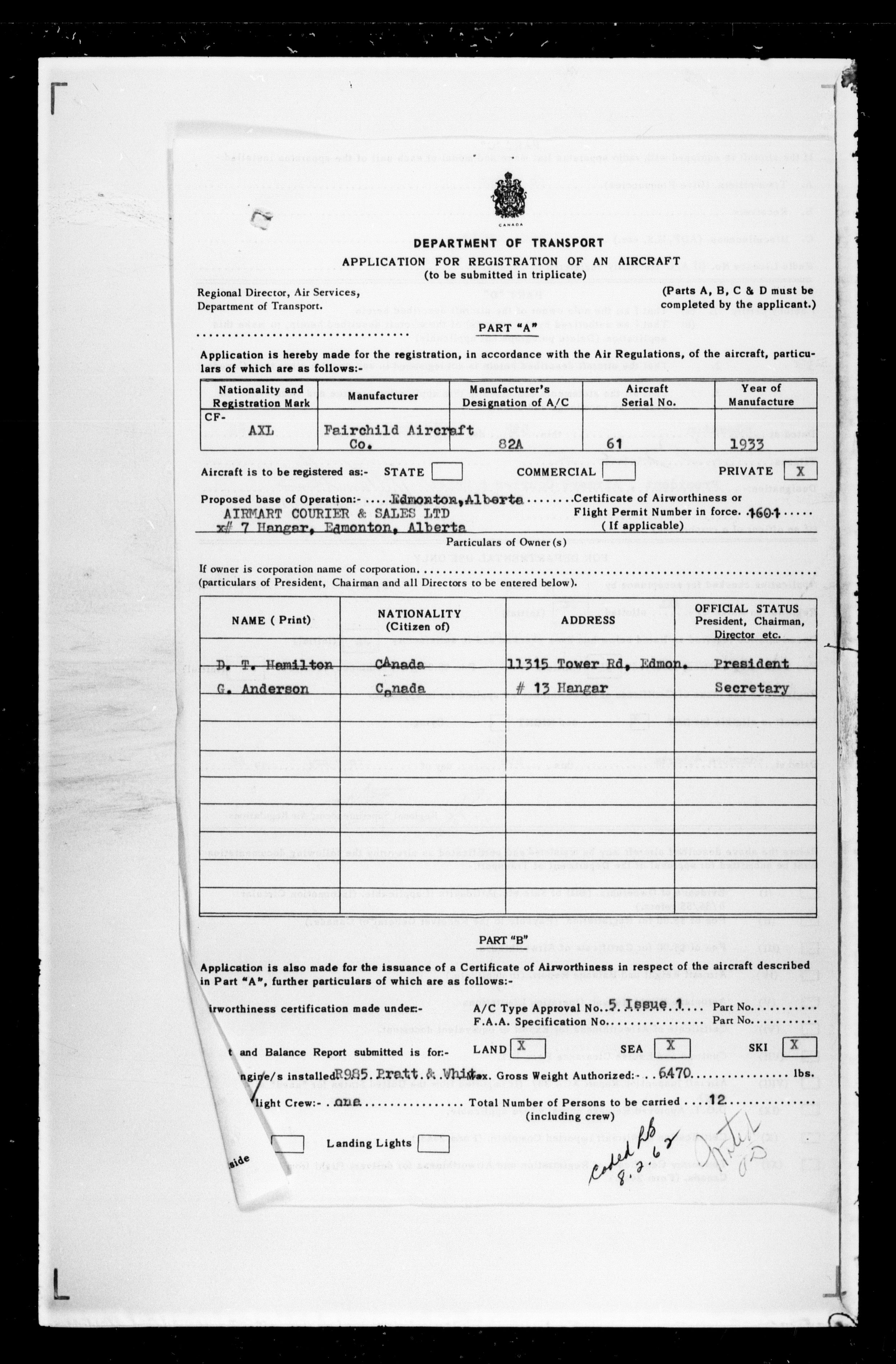 Department of Transport : Civil aircraft registration, inspection and operation files, 1920-1986 : T-7445