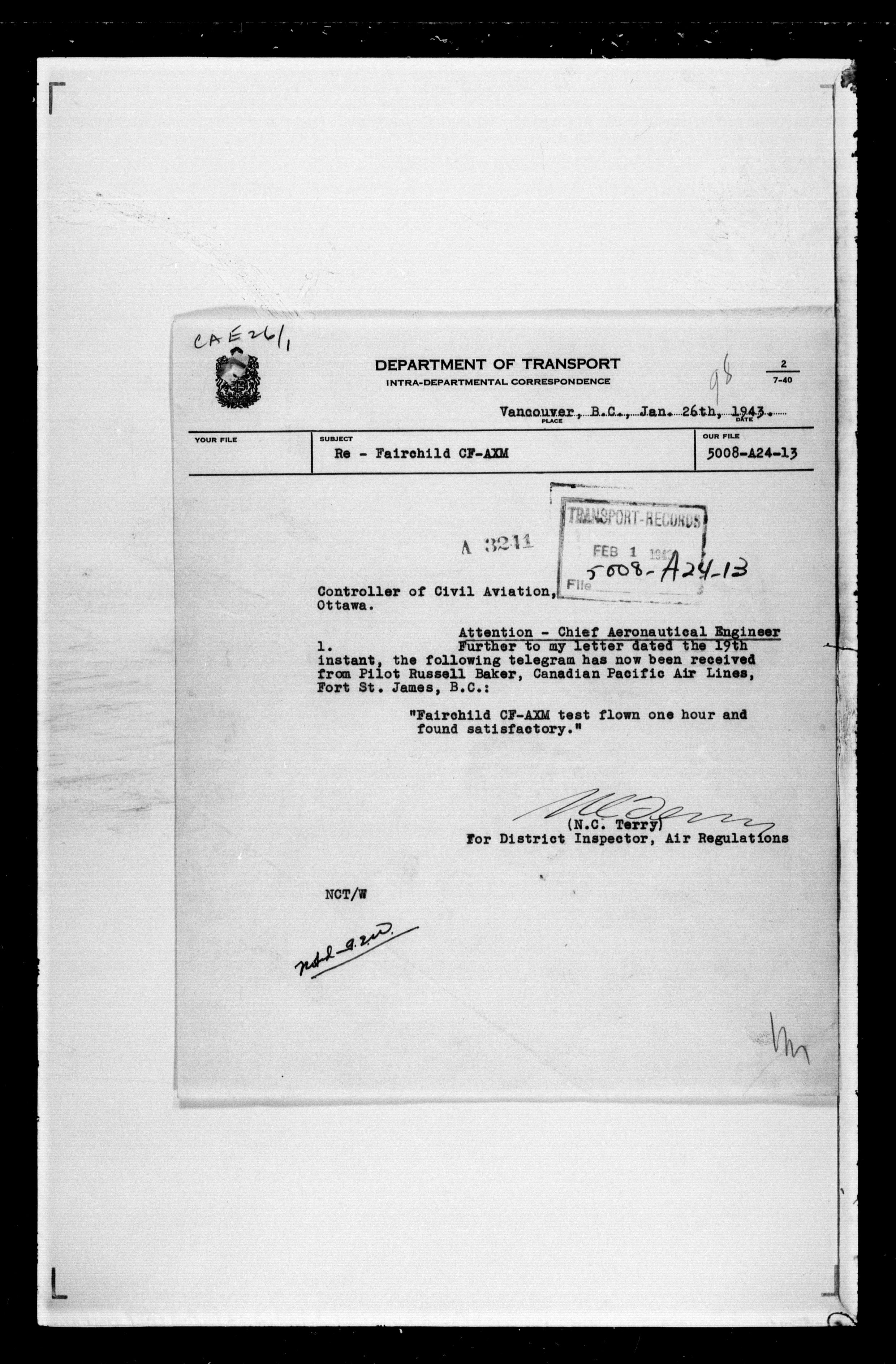 Department of Transport : Civil aircraft registration, inspection and operation files, block 5008, 1920-1986 - 7446