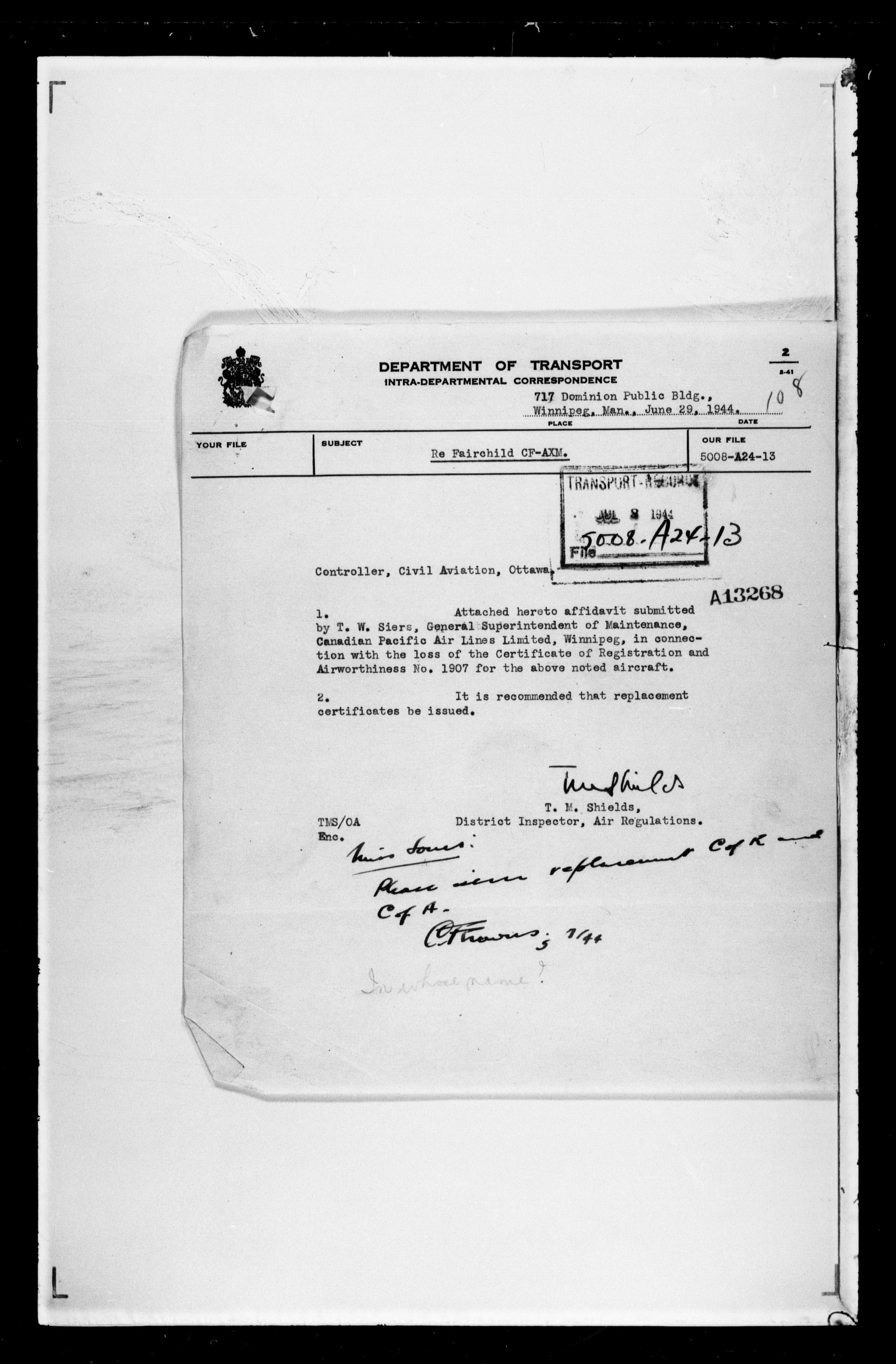 Department of Transport : Civil aircraft registration, inspection and operation files, 1920-1986 : T-7446