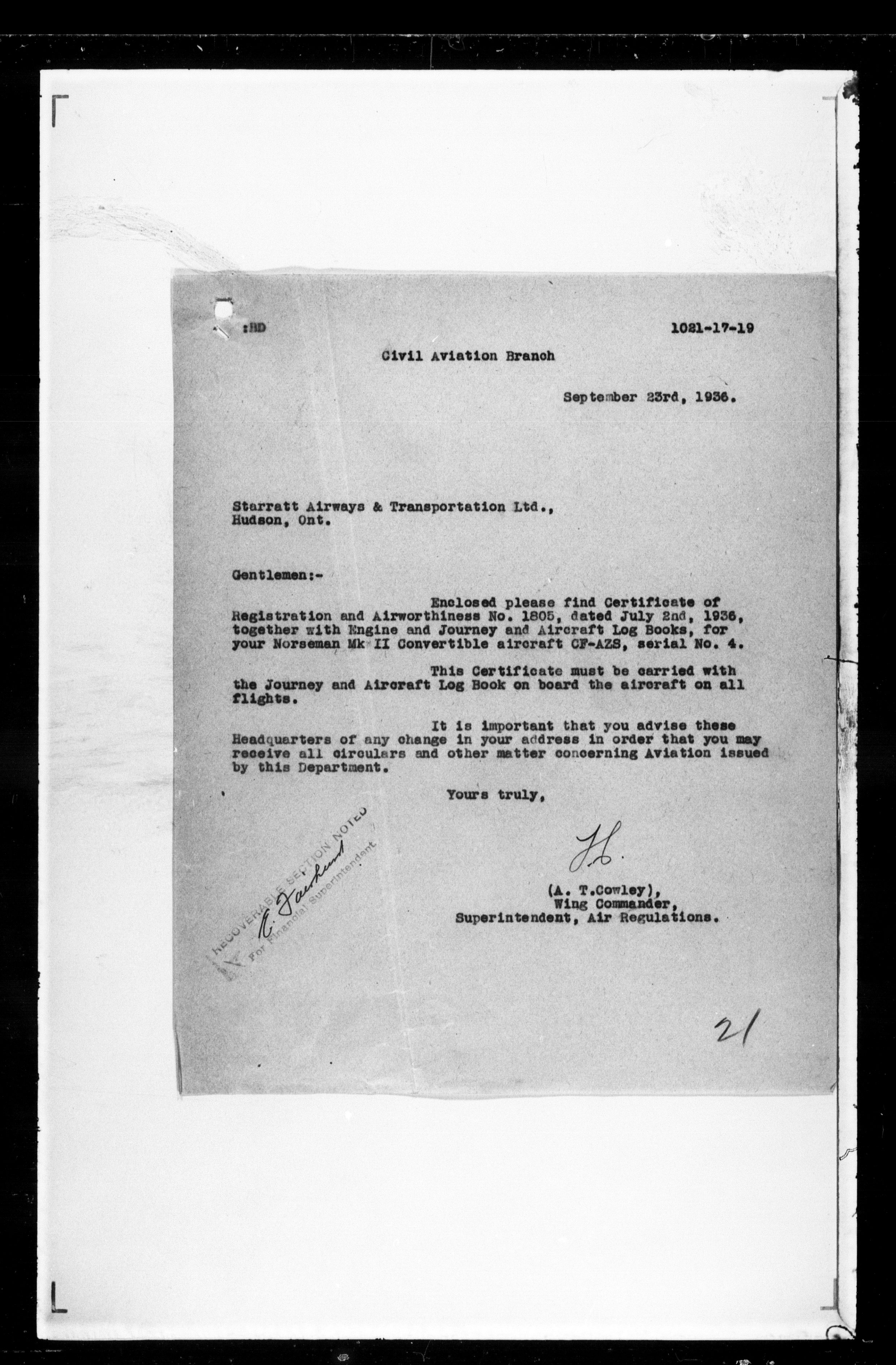 Department of Transport : Civil aircraft registration, inspection and operation files, block 5008, 1920-1986 - 7449