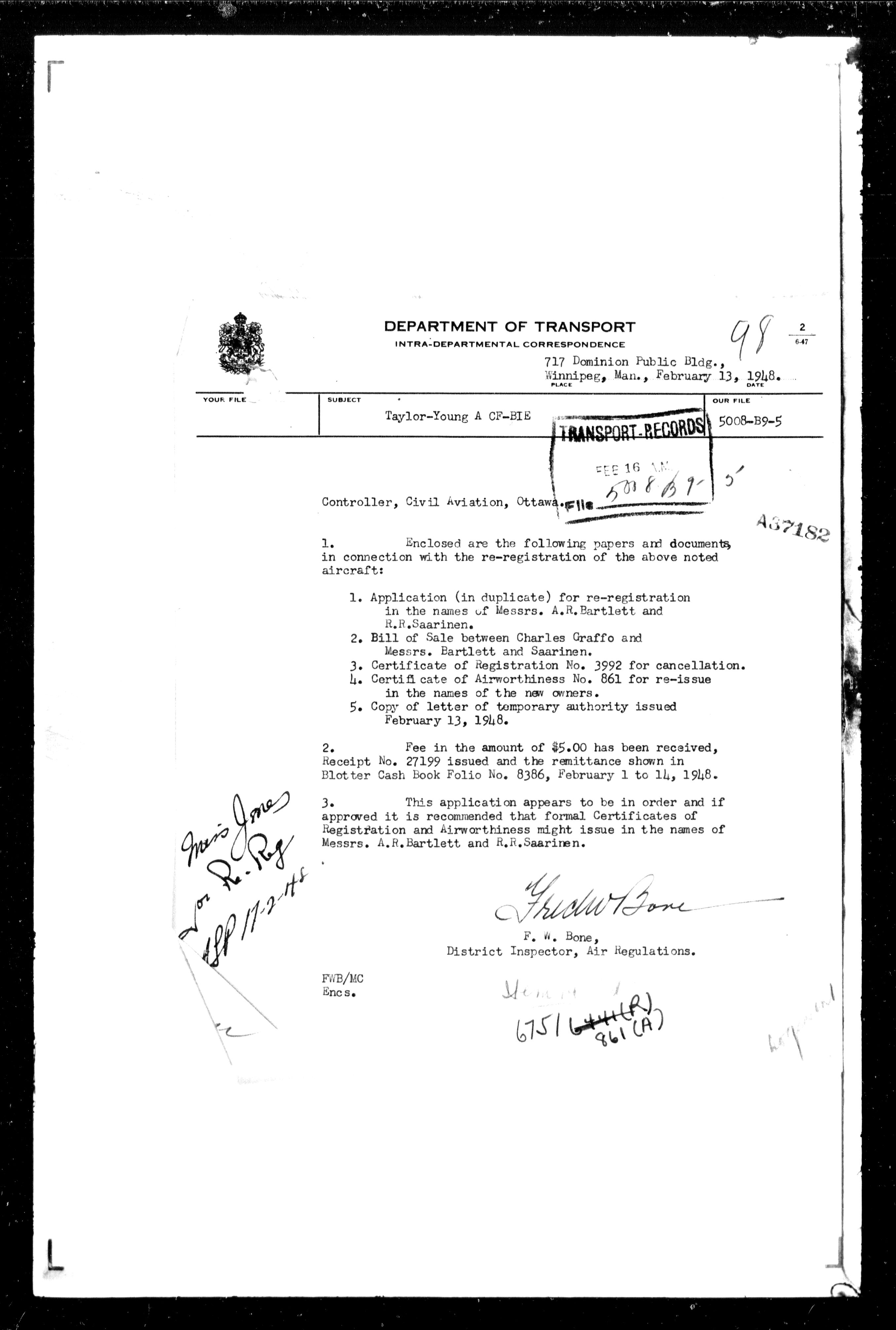 Department of Transport : Civil aircraft registration, inspection and operation files, block 5008, 1920-1986 - 7457