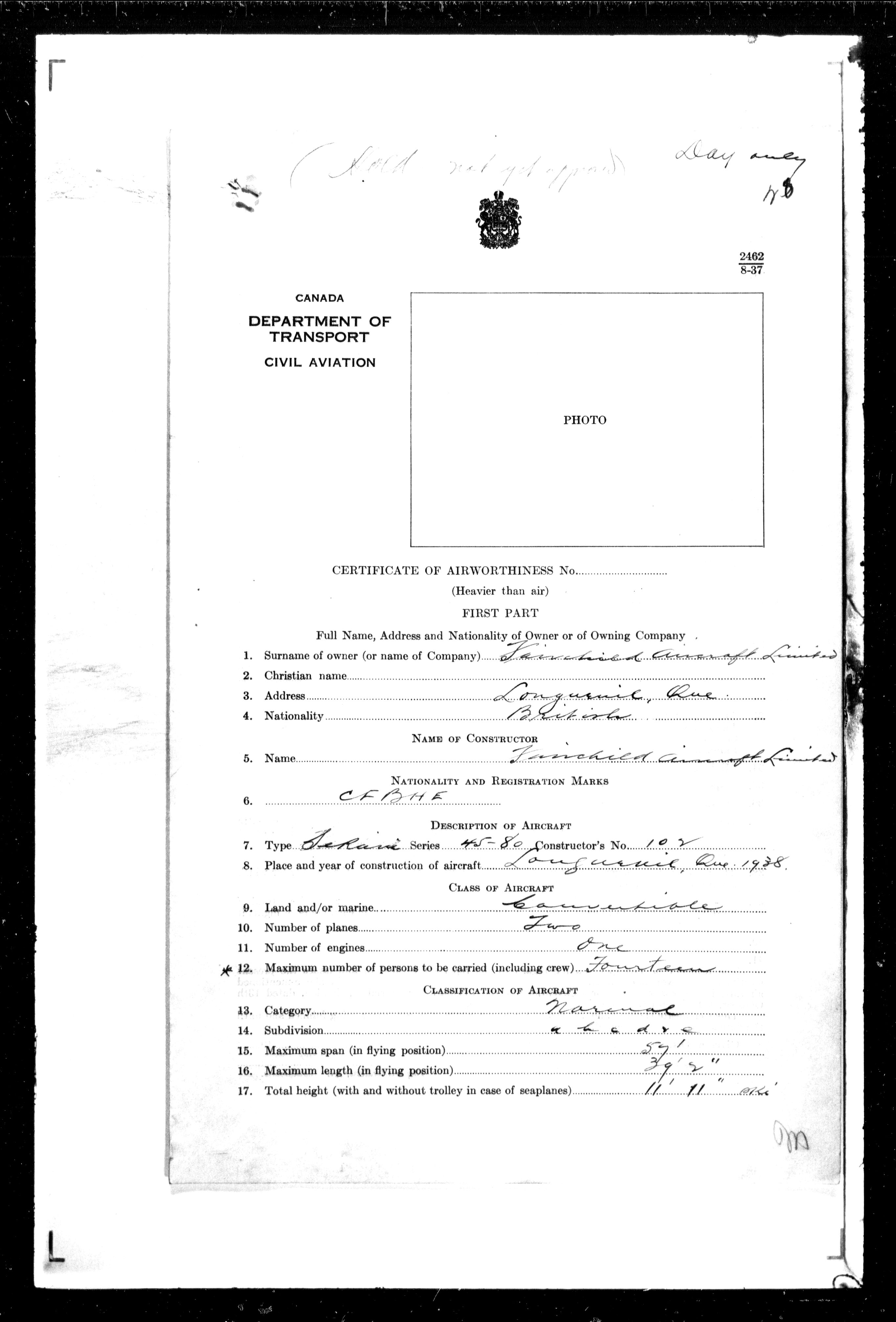 Department of Transport : Civil aircraft registration, inspection and operation files, block 5008, 1920-1986 - 7457