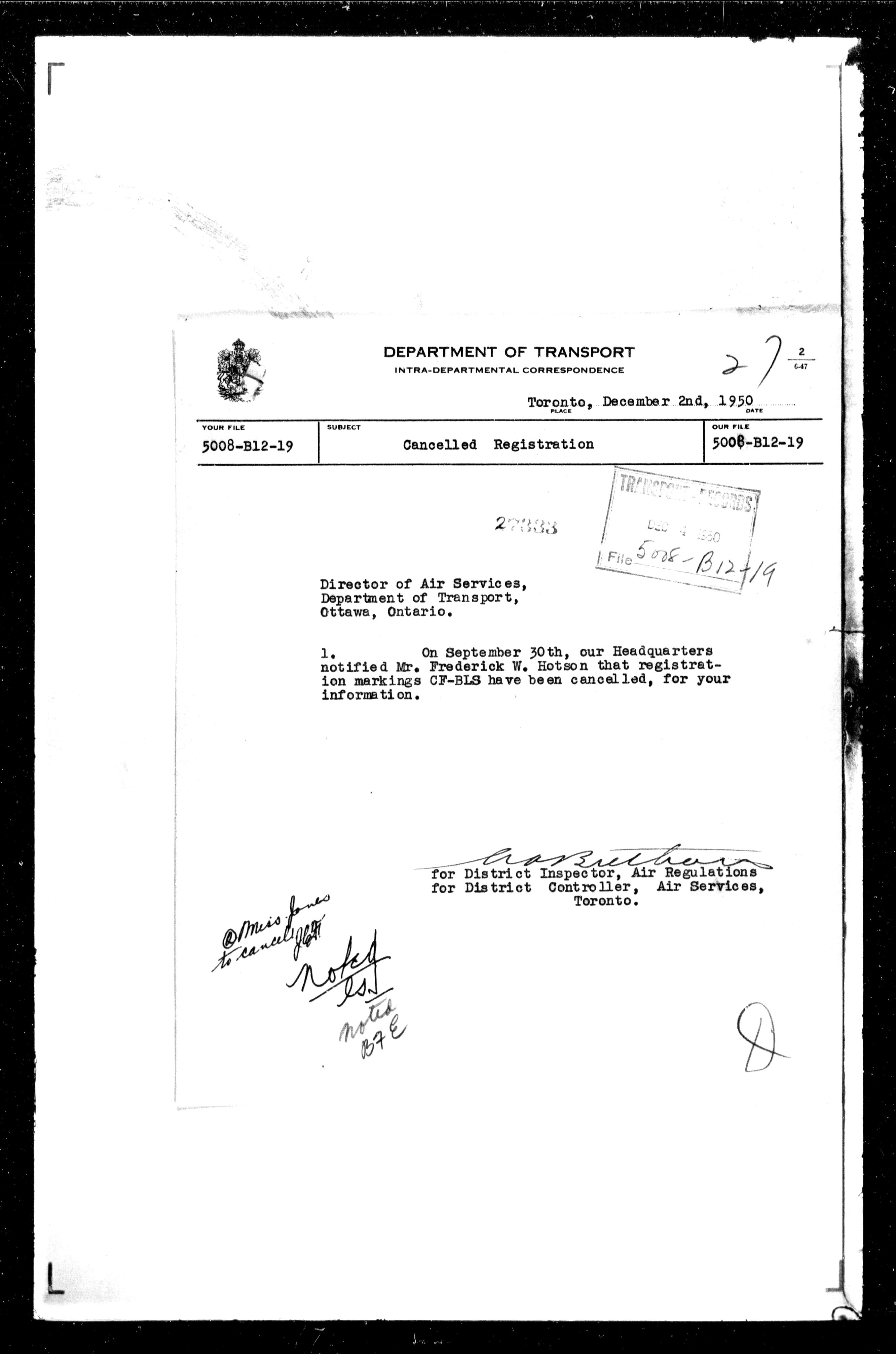 Department of Transport : Civil aircraft registration, inspection and operation files, block 5008, 1920-1986 - 7462