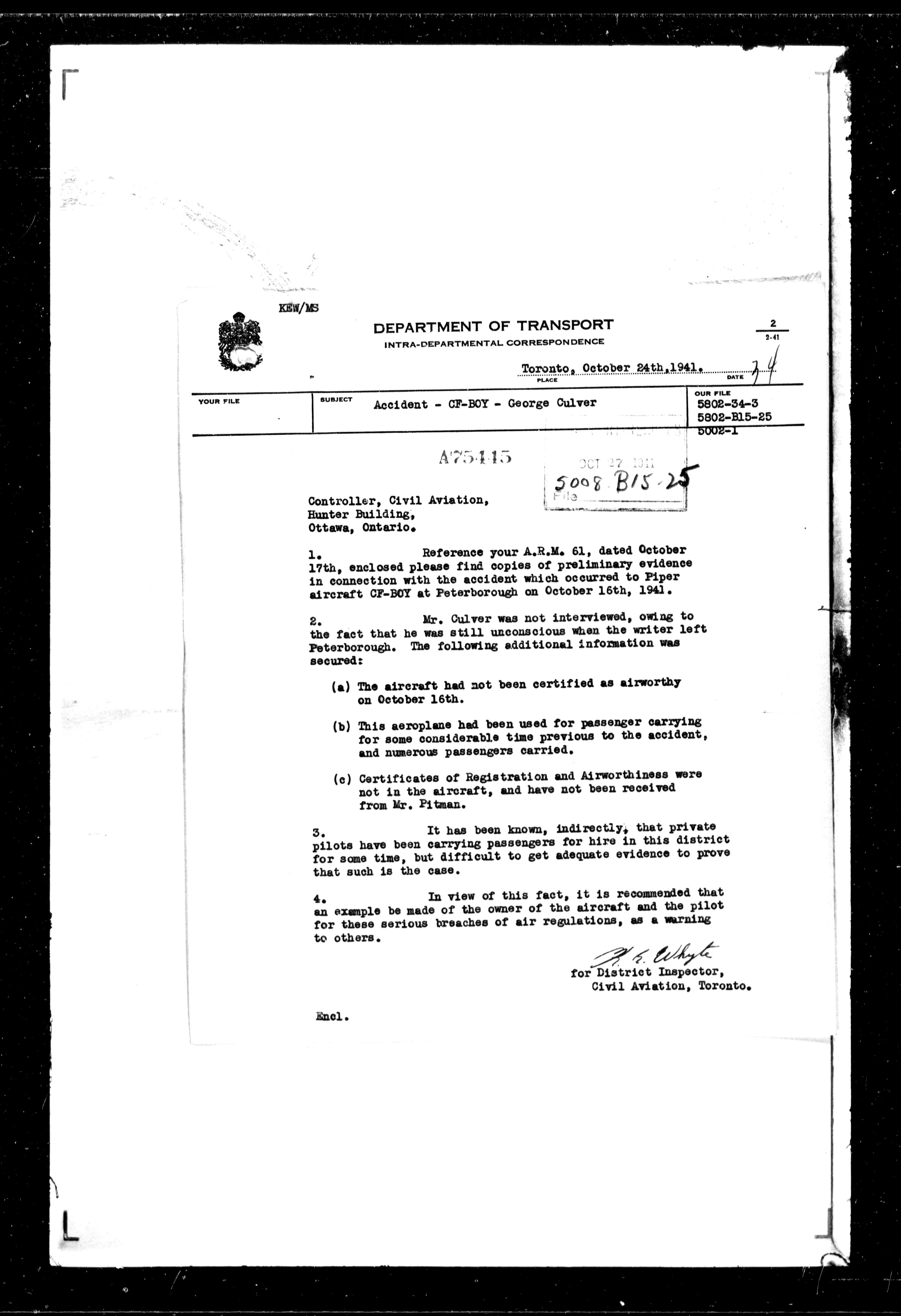 Department of Transport : Civil aircraft registration, inspection and operation files, block 5008, 1920-1986 - 7465