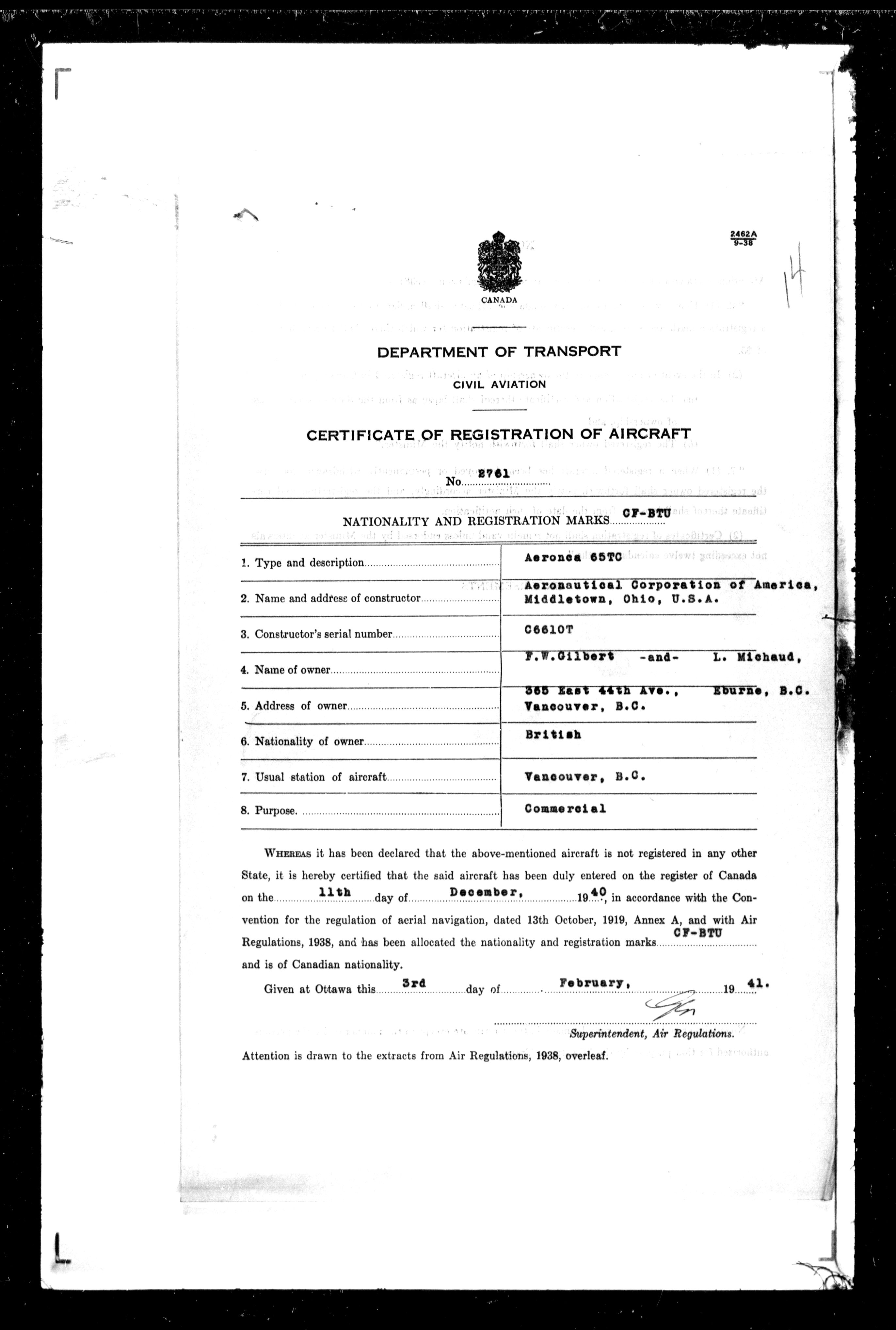 Department of Transport : Civil aircraft registration, inspection and operation files, block 5008, 1920-1986 - 7467