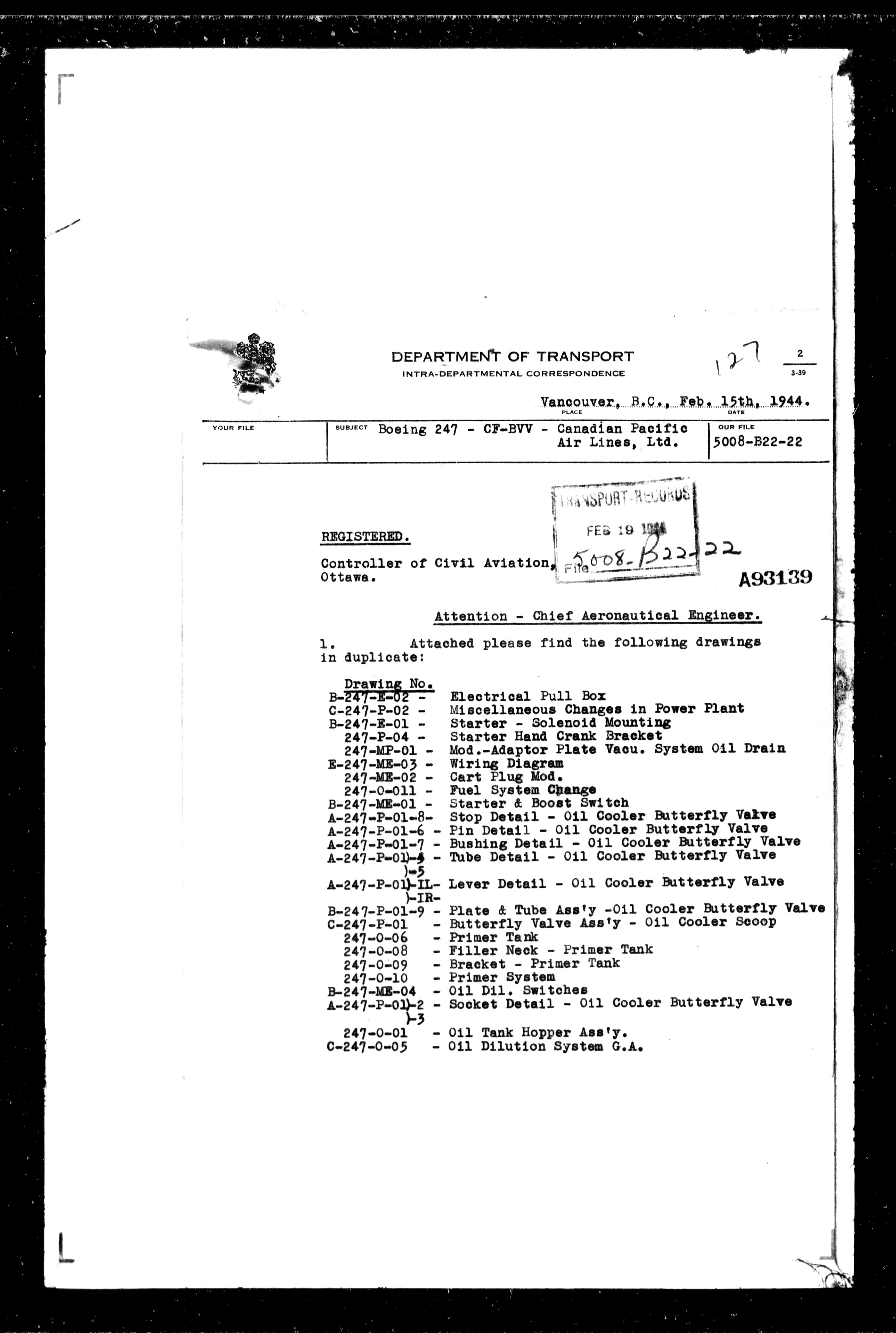 Department of Transport : Civil aircraft registration, inspection and operation files, block 5008, 1920-1986 - 7469