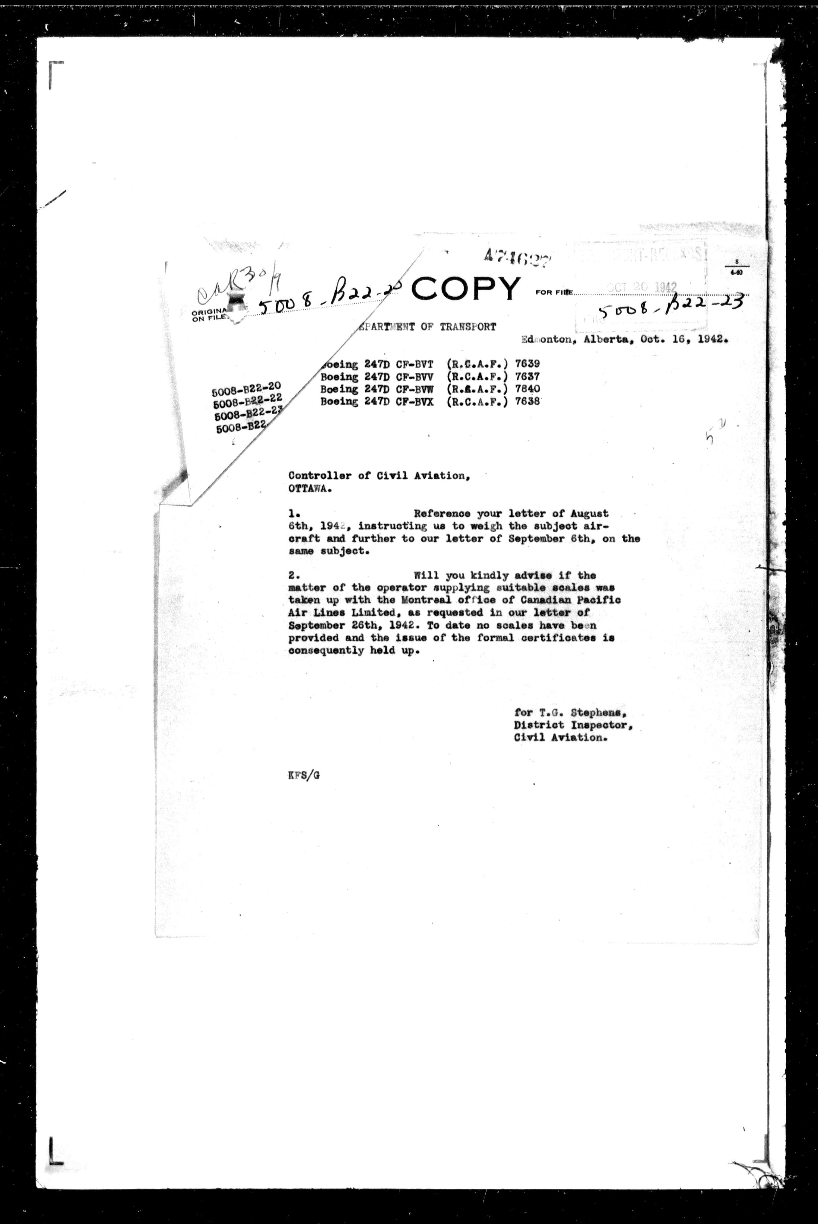 Department of Transport : Civil aircraft registration, inspection and operation files, block 5008, 1920-1986 - 7470