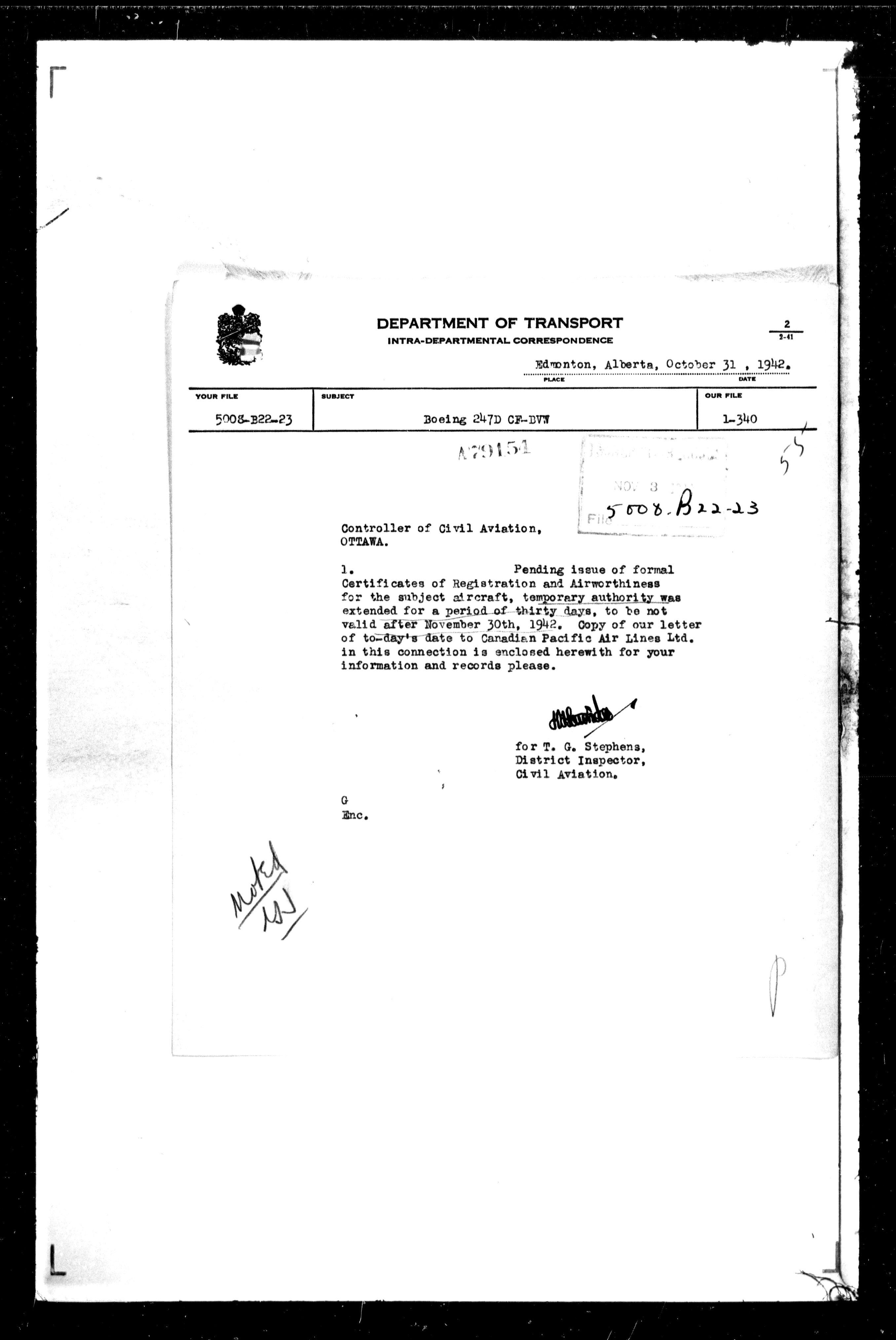 Department of Transport : Civil aircraft registration, inspection and operation files, block 5008, 1920-1986 - 7470