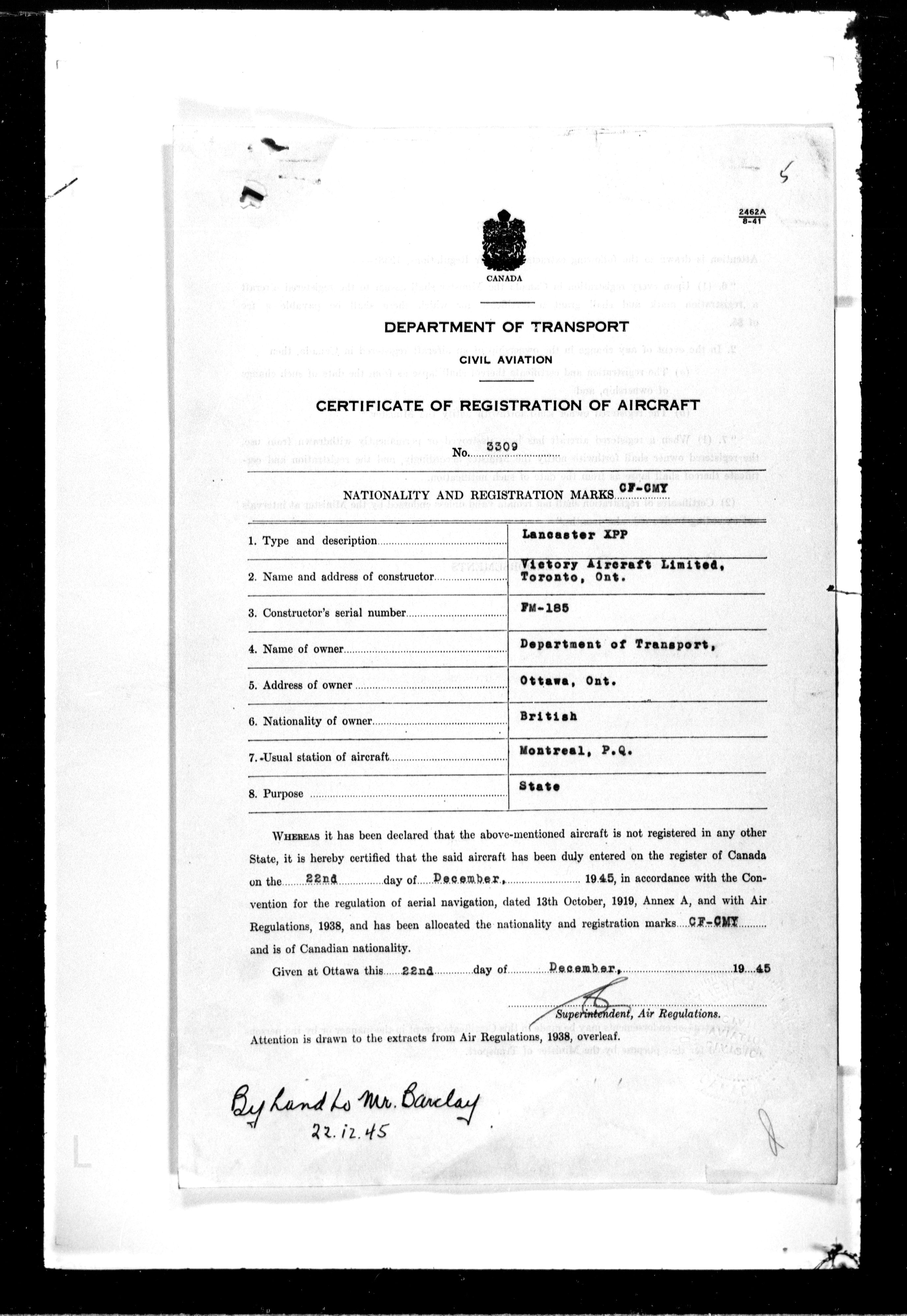 Department of Transport : Civil aircraft registration, inspection and operation files, 1920-1986 : T-7486