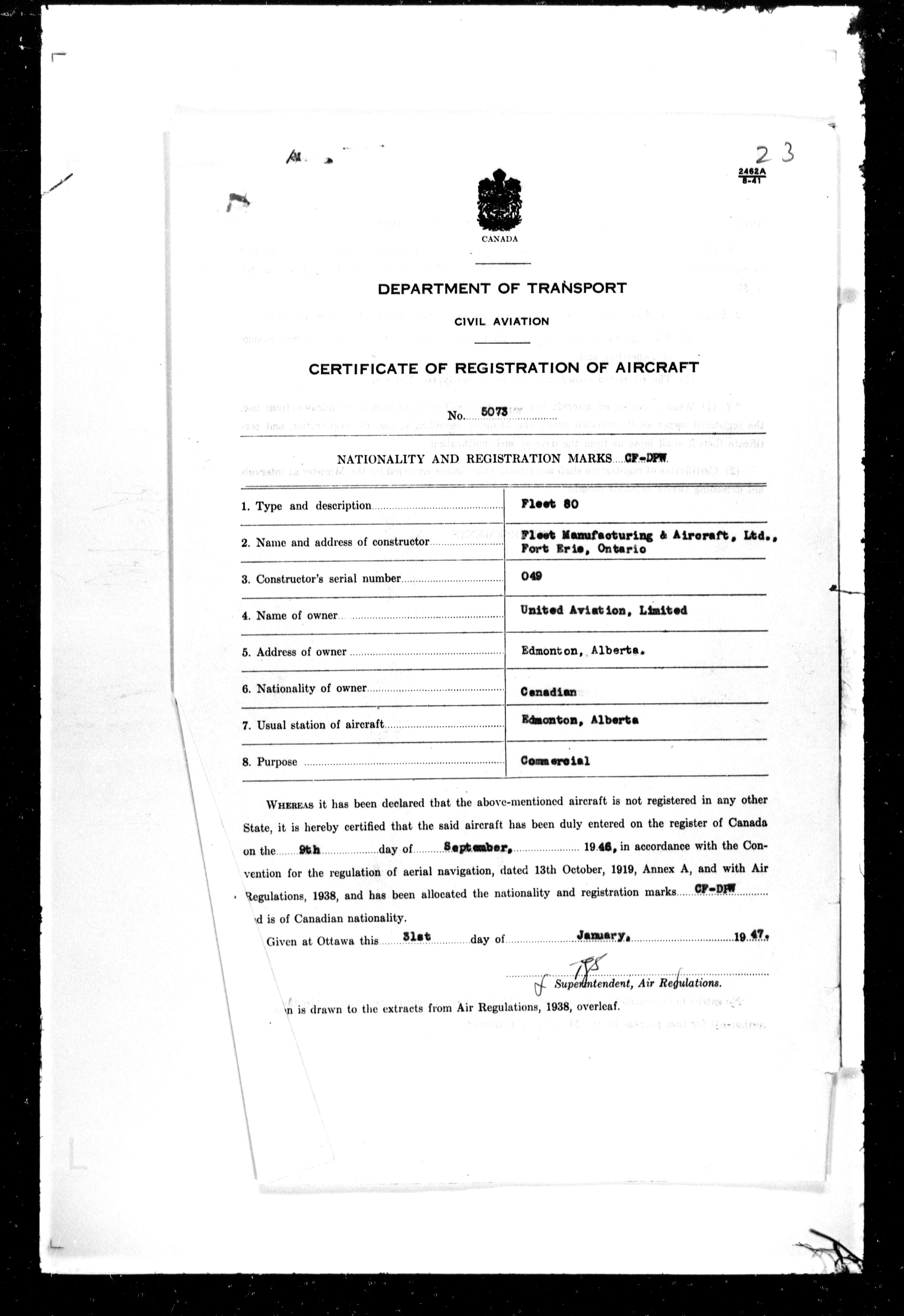 Department of Transport : Civil aircraft registration, inspection and operation files, block 5008, 1920-1986 - 7492