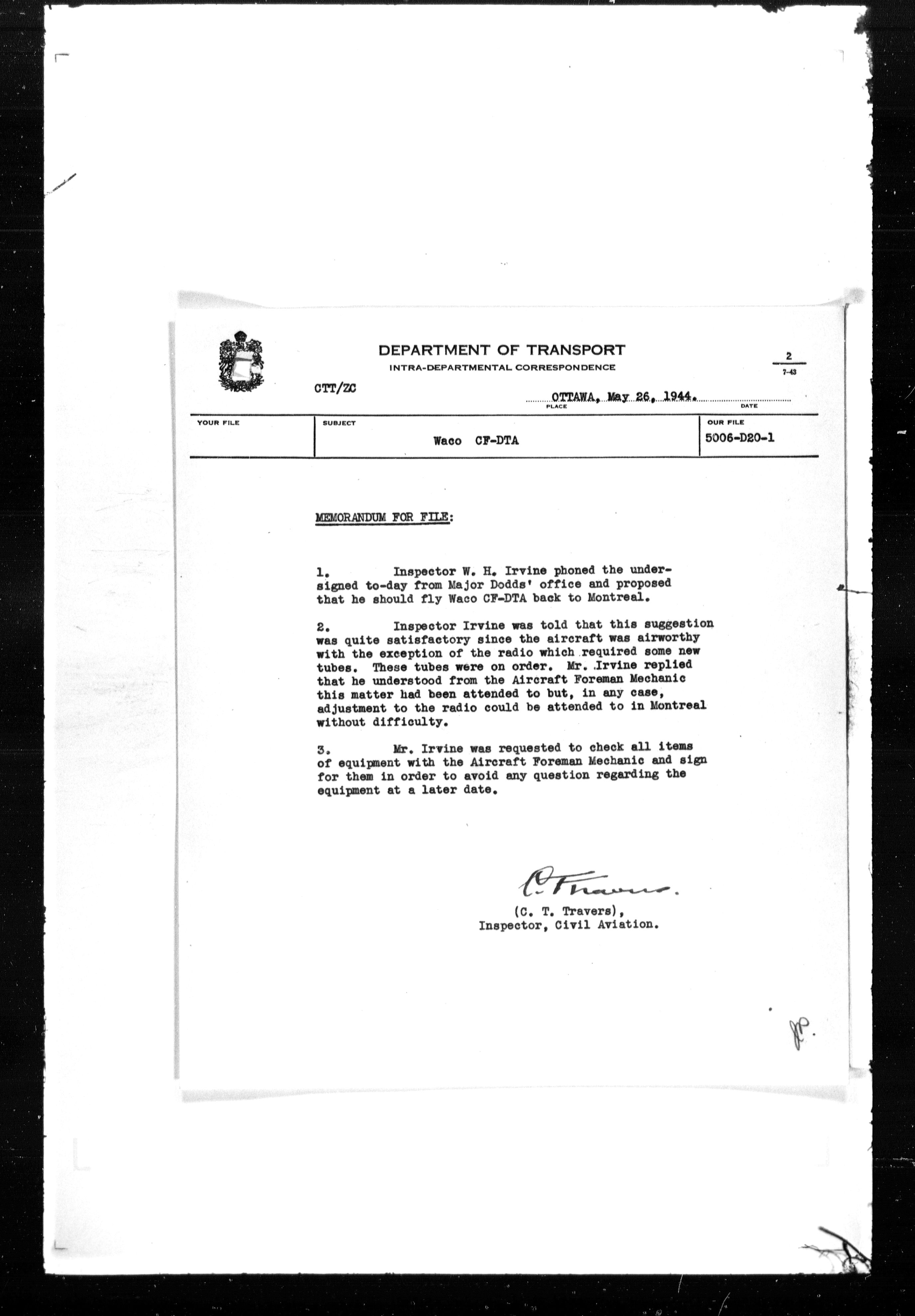 Department of Transport : Civil aircraft registration, inspection and operation files, 1920-1986 : T-7493