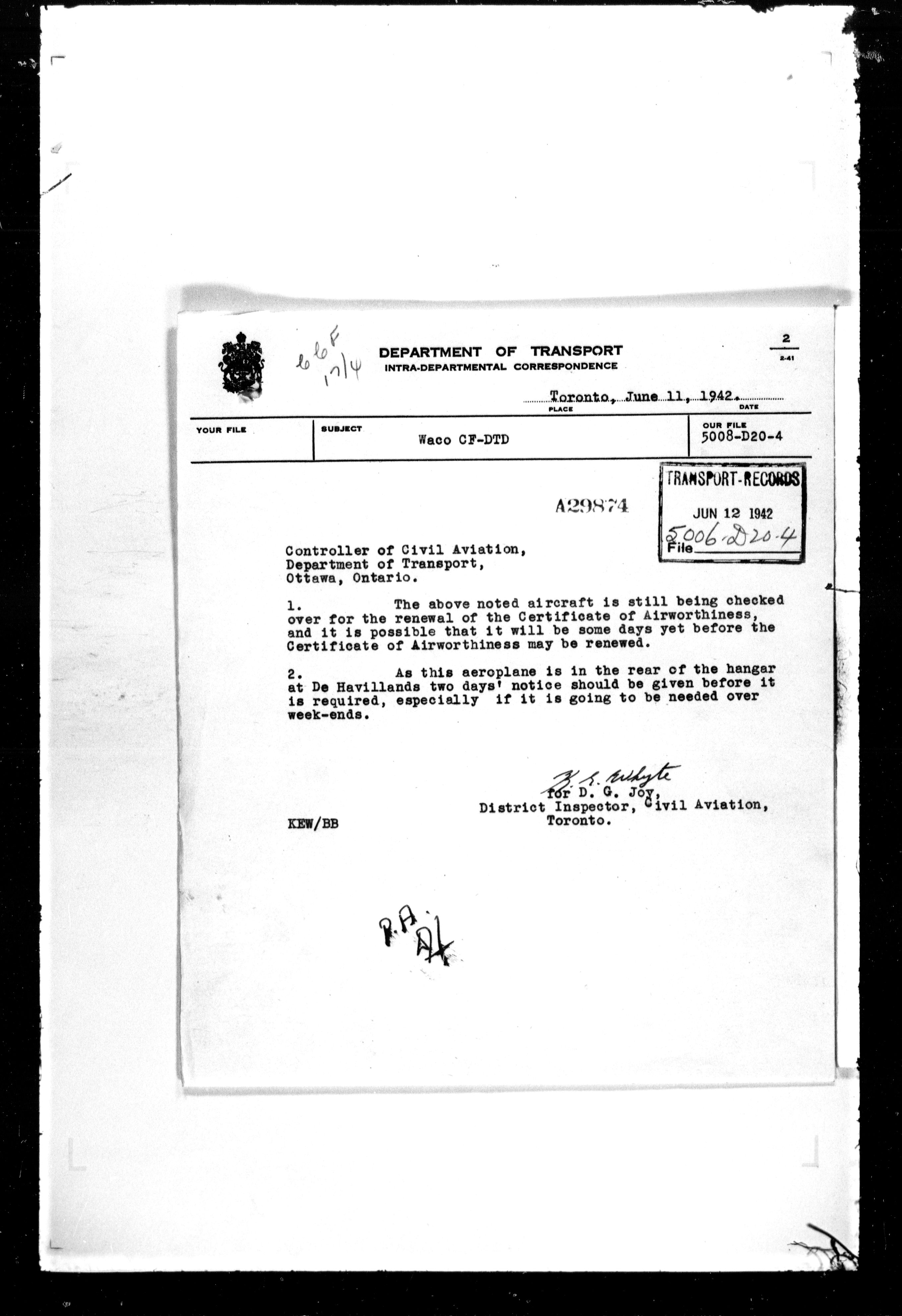 Department of Transport : Civil aircraft registration, inspection and operation files, block 5008, 1920-1986 - 7494