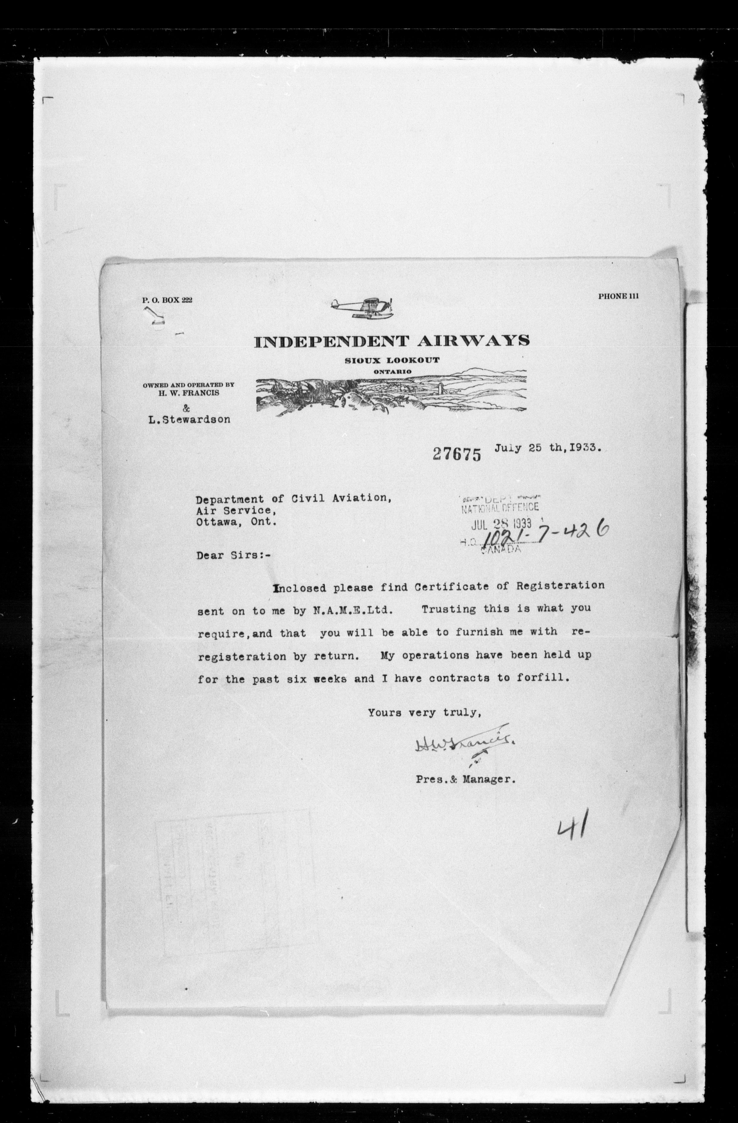 Department of Transport : Civil aircraft registration, inspection and operation files, block 5008, 1920-1986 - 7507