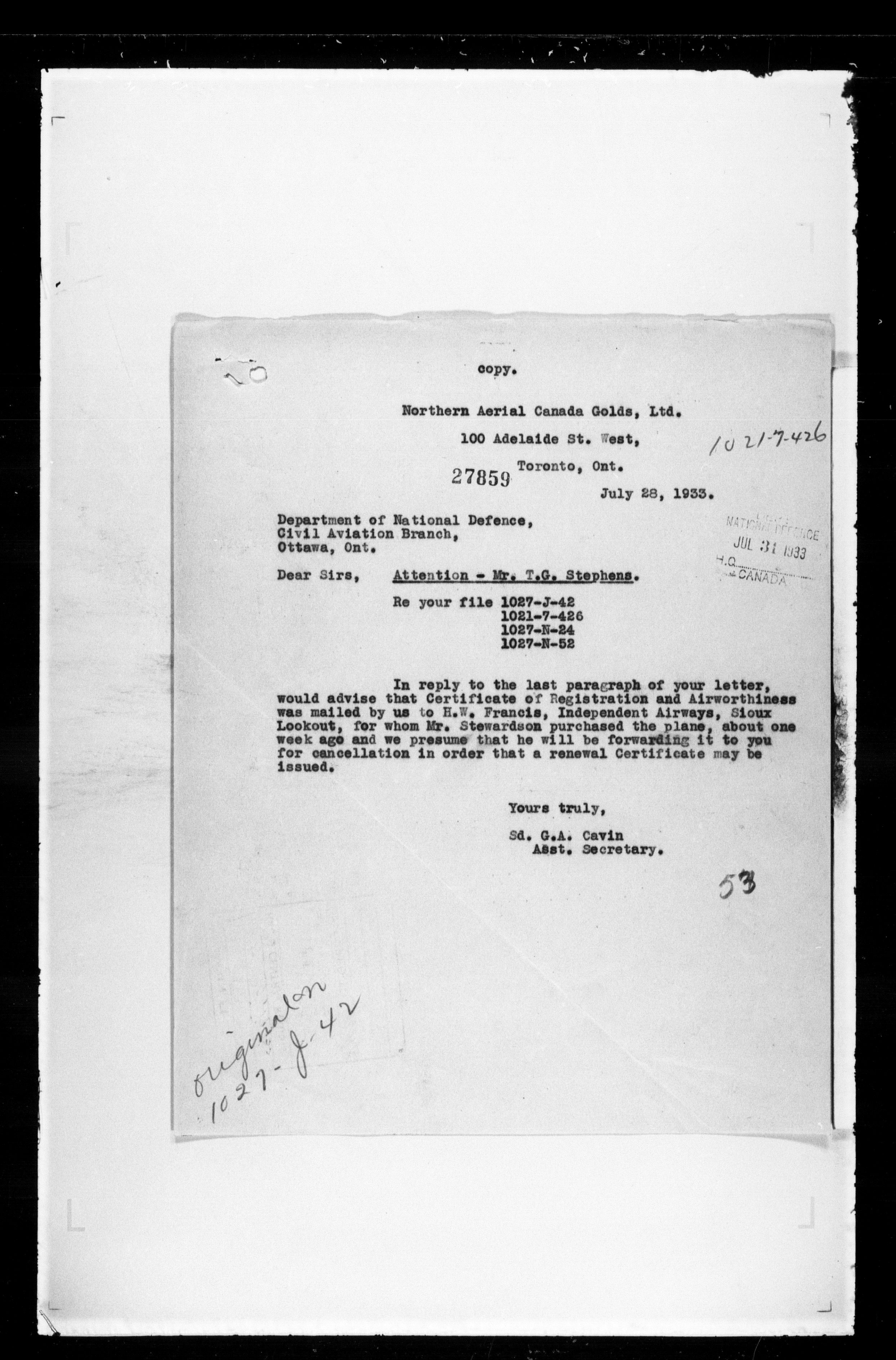 Department of Transport : Civil aircraft registration, inspection and operation files, block 5008, 1920-1986 - 7507