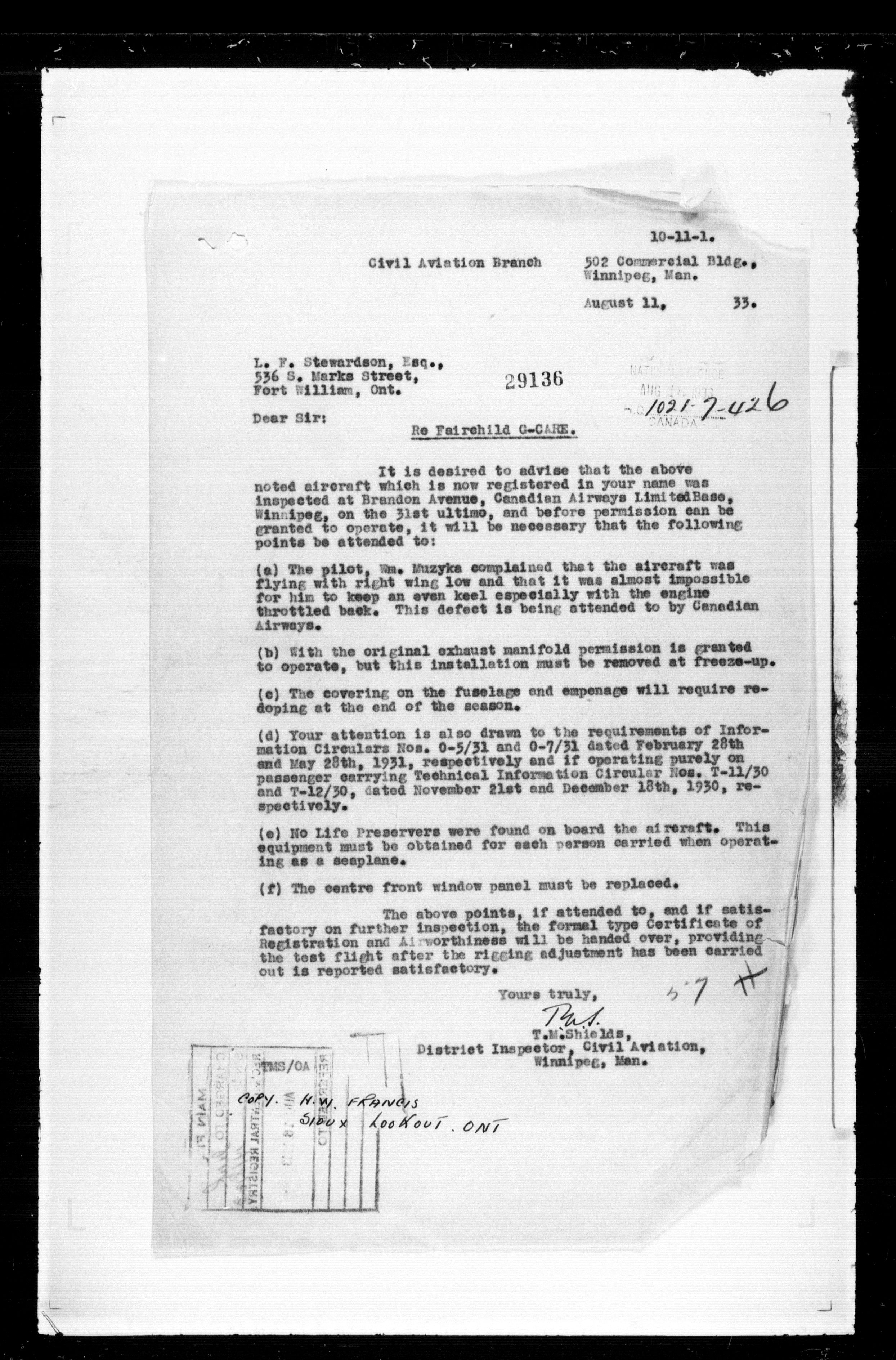 Department of Transport : Civil aircraft registration, inspection and operation files, block 5008, 1920-1986 - 7507