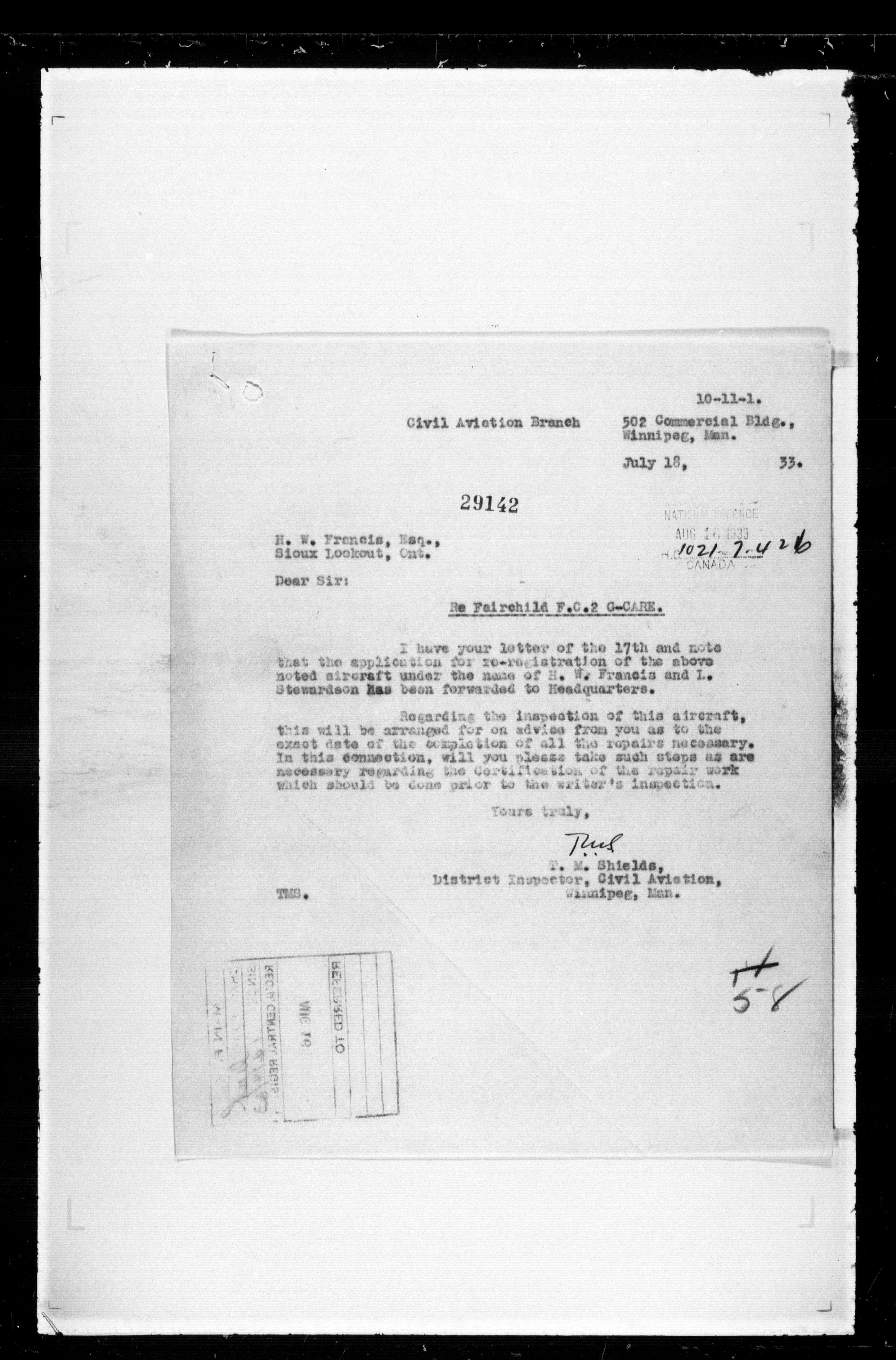 Department of Transport : Civil aircraft registration, inspection and operation files, 1920-1986 : T-7507