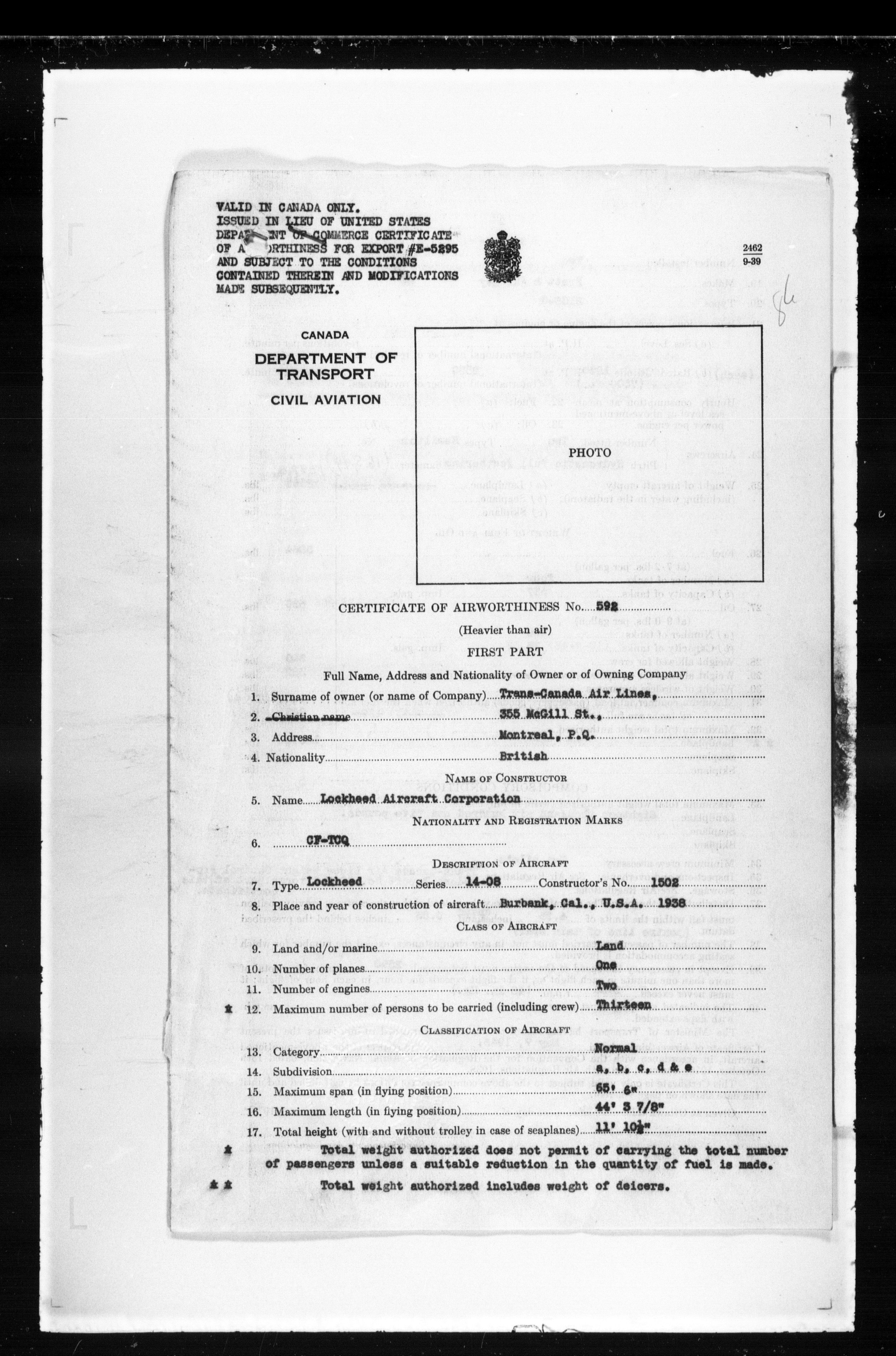 Department of Transport : Civil aircraft registration, inspection and operation files, 1920-1986 : T-7513