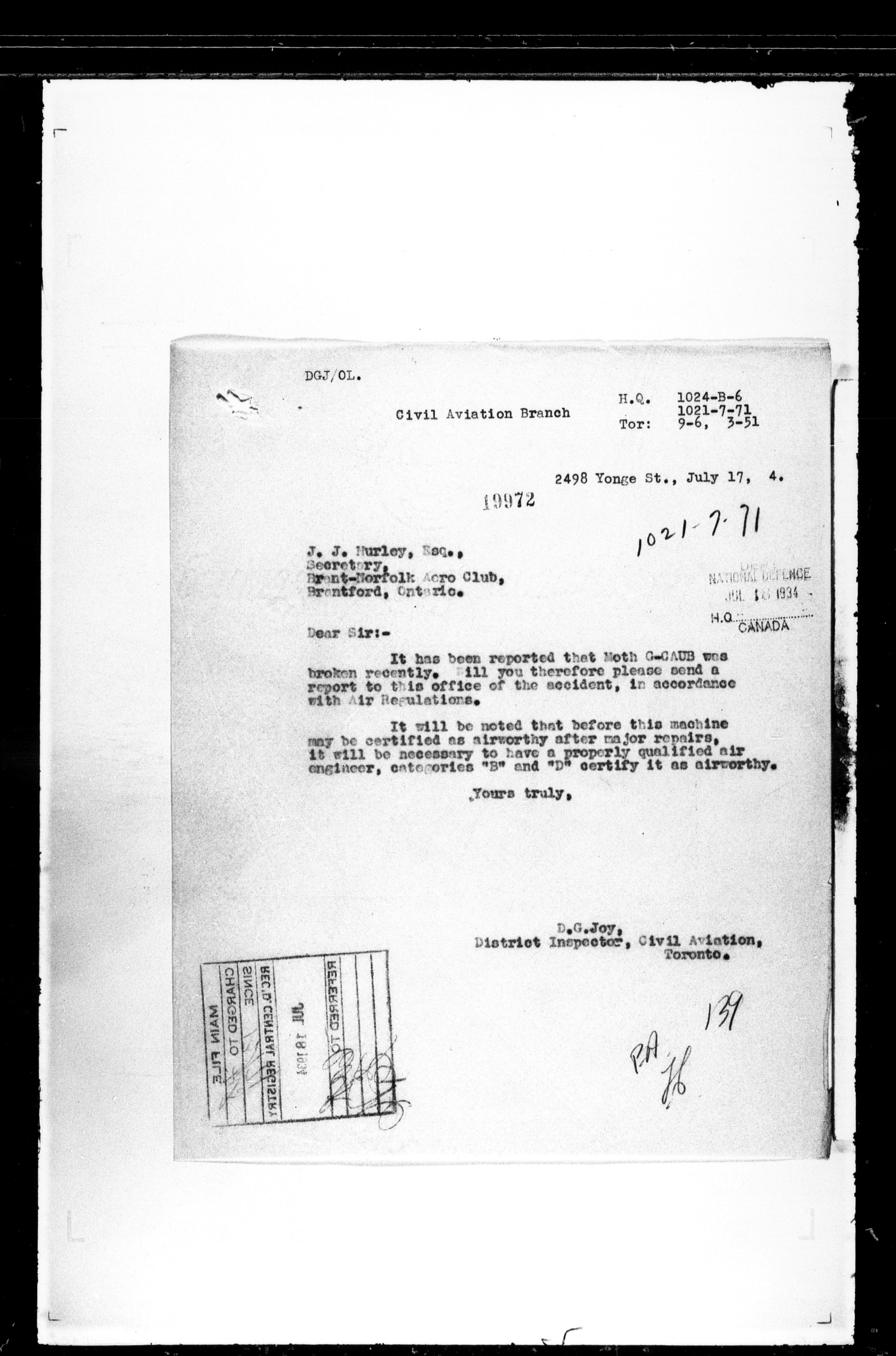 Department of Transport : Civil aircraft registration, inspection and operation files, block 5008, 1920-1986 - 7521