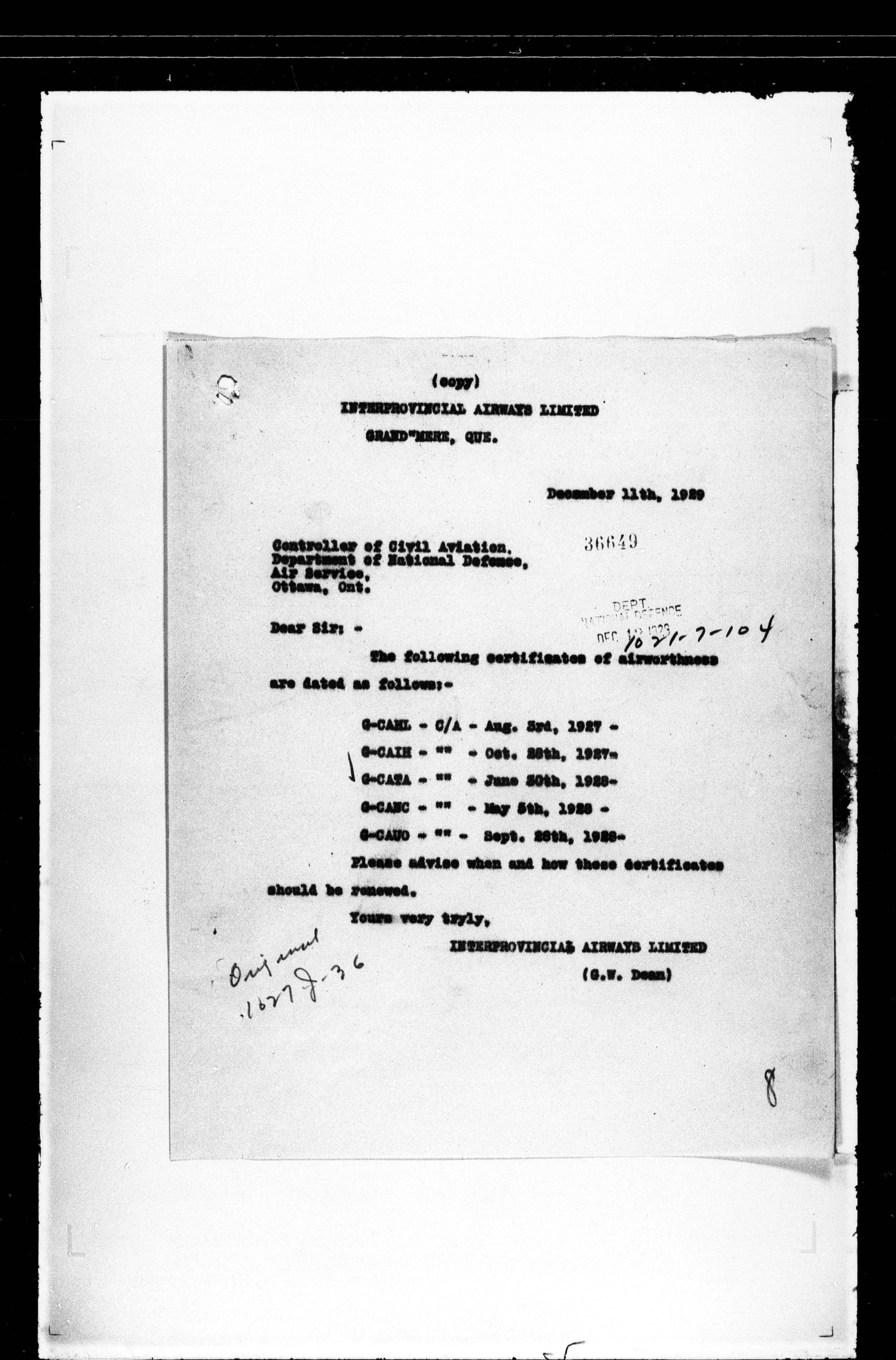 Department of Transport : Civil aircraft registration, inspection and operation files, 1920-1986 : T-7521