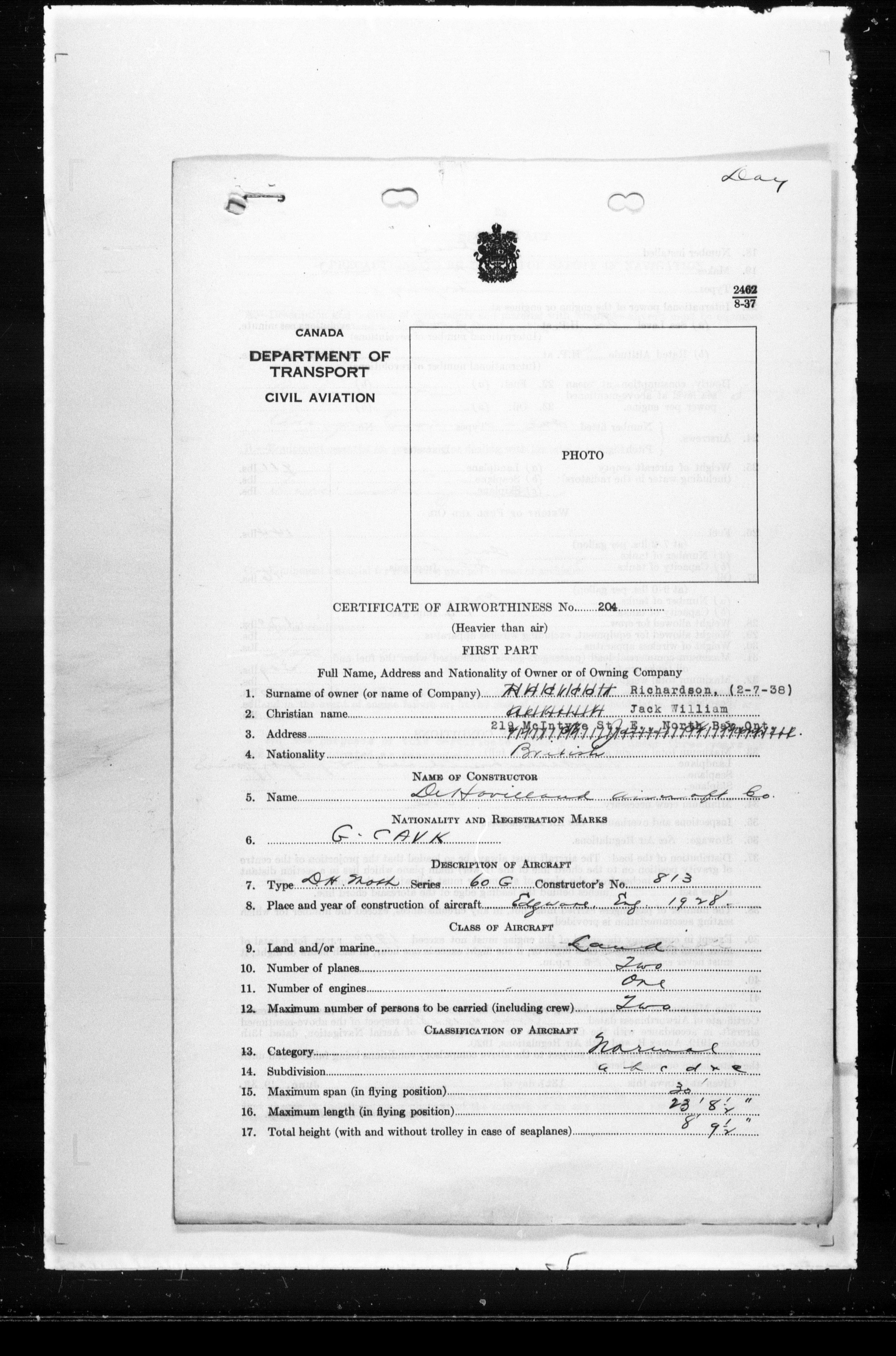 Department of Transport : Civil aircraft registration, inspection and operation files, block 5008, 1920-1986 - 7522