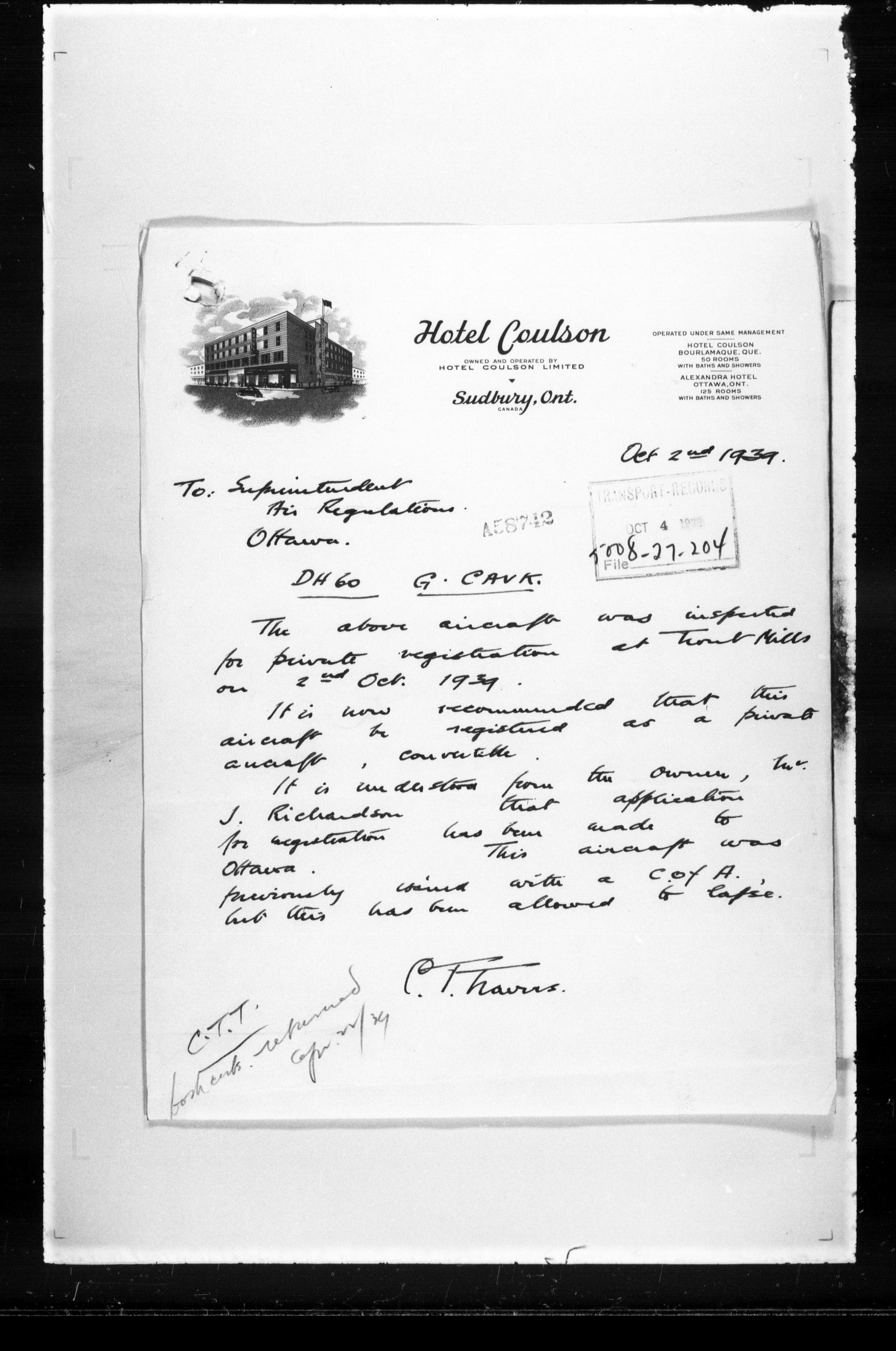 Department of Transport : Civil aircraft registration, inspection and operation files, block 5008, 1920-1986 - 7522