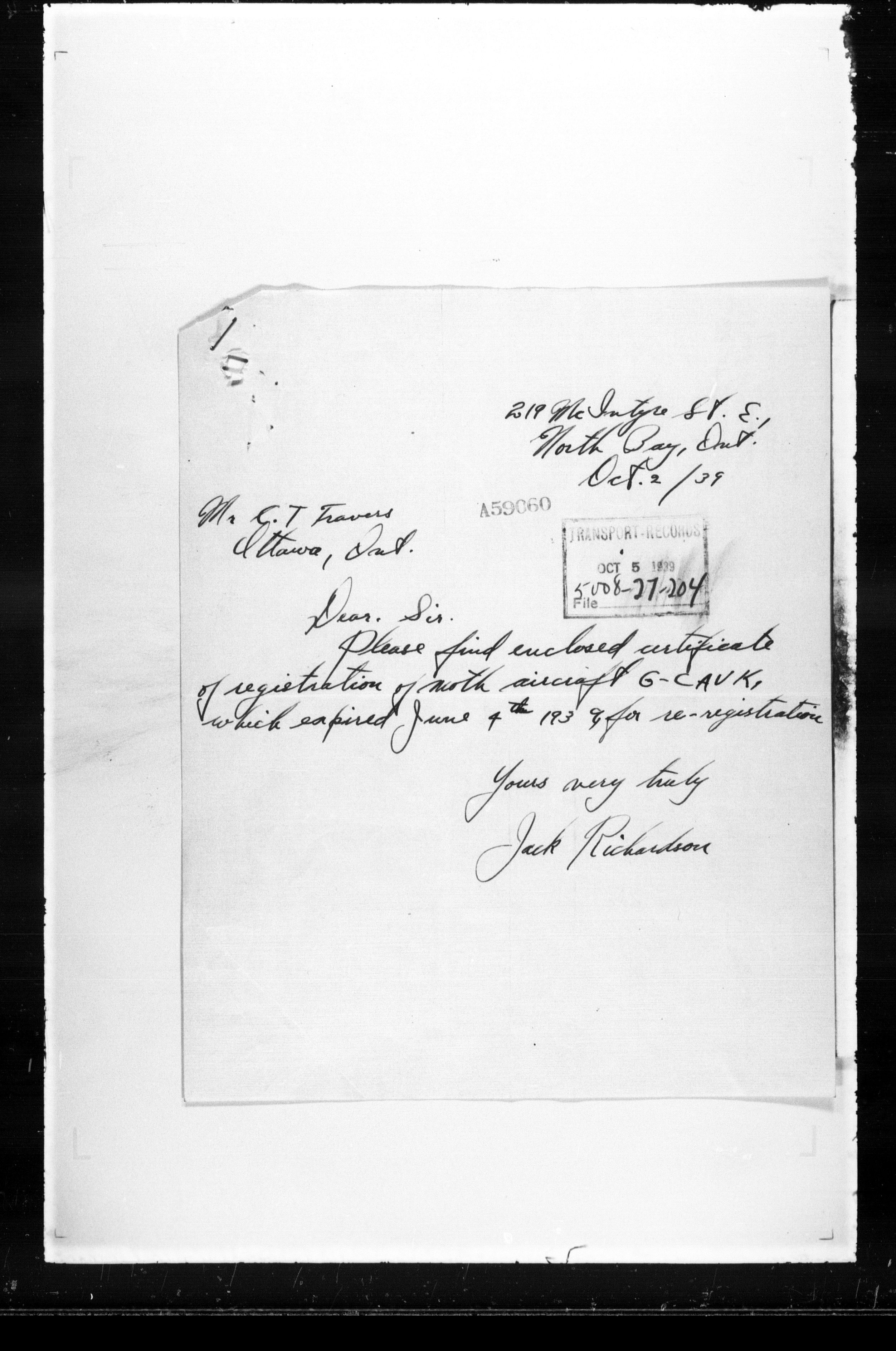 Department of Transport : Civil aircraft registration, inspection and operation files, 1920-1986 : T-7522