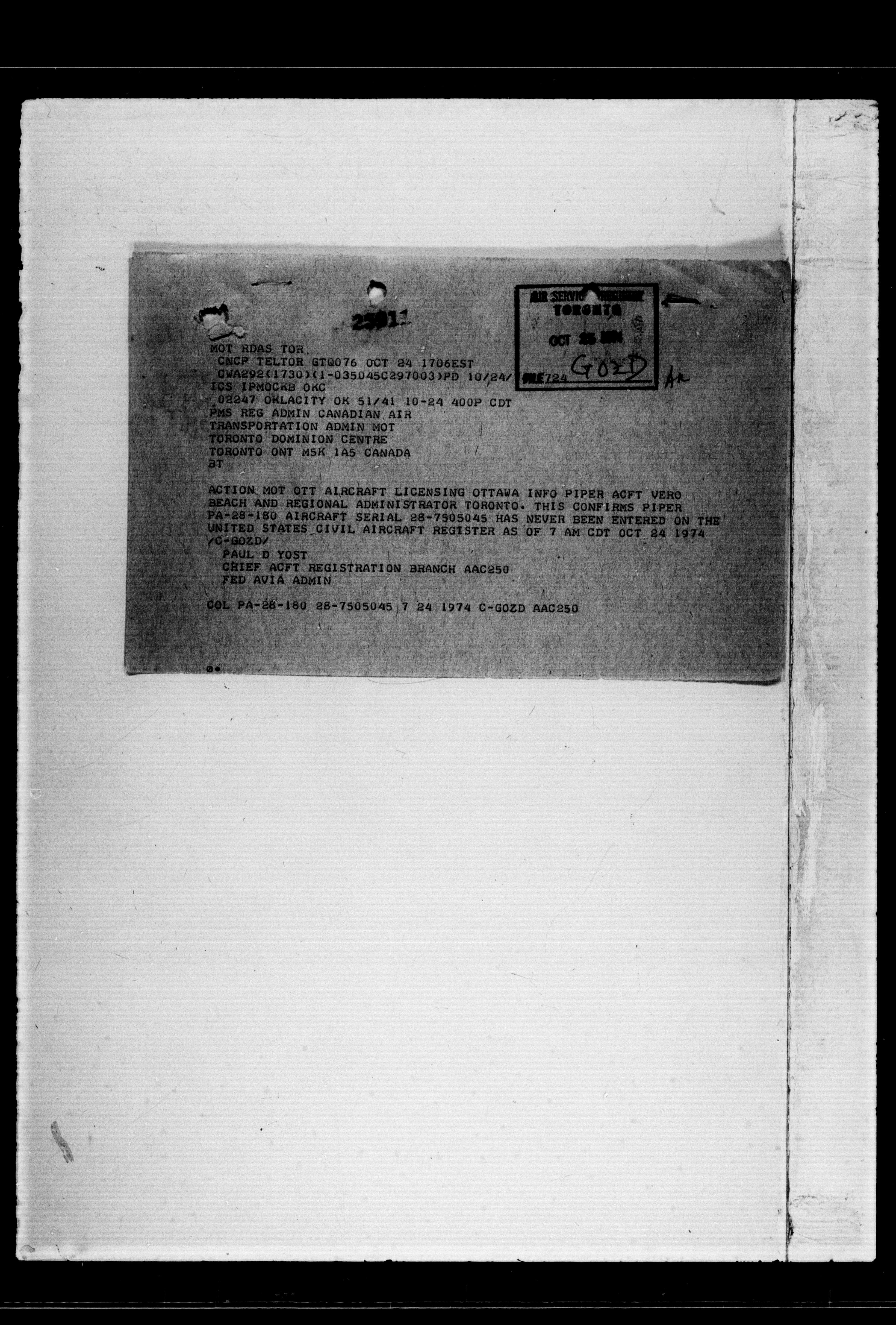 Department of Transport : Civil aircraft registration, inspection and operation files, block 5008, 1920-1986 - 7644