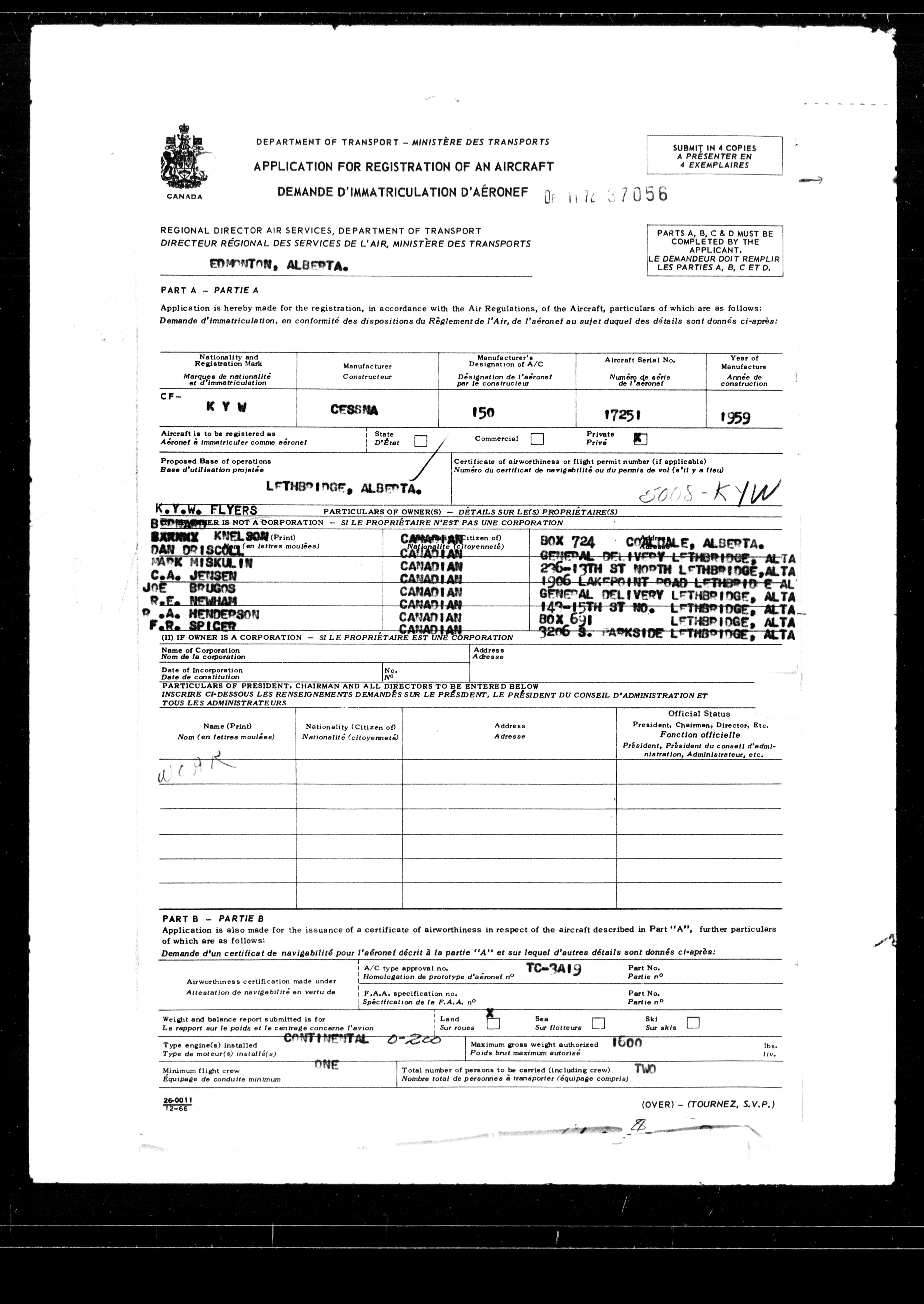 Department of Transport : Civil aircraft registration, inspection and operation files, 1920-1986 : T-7655