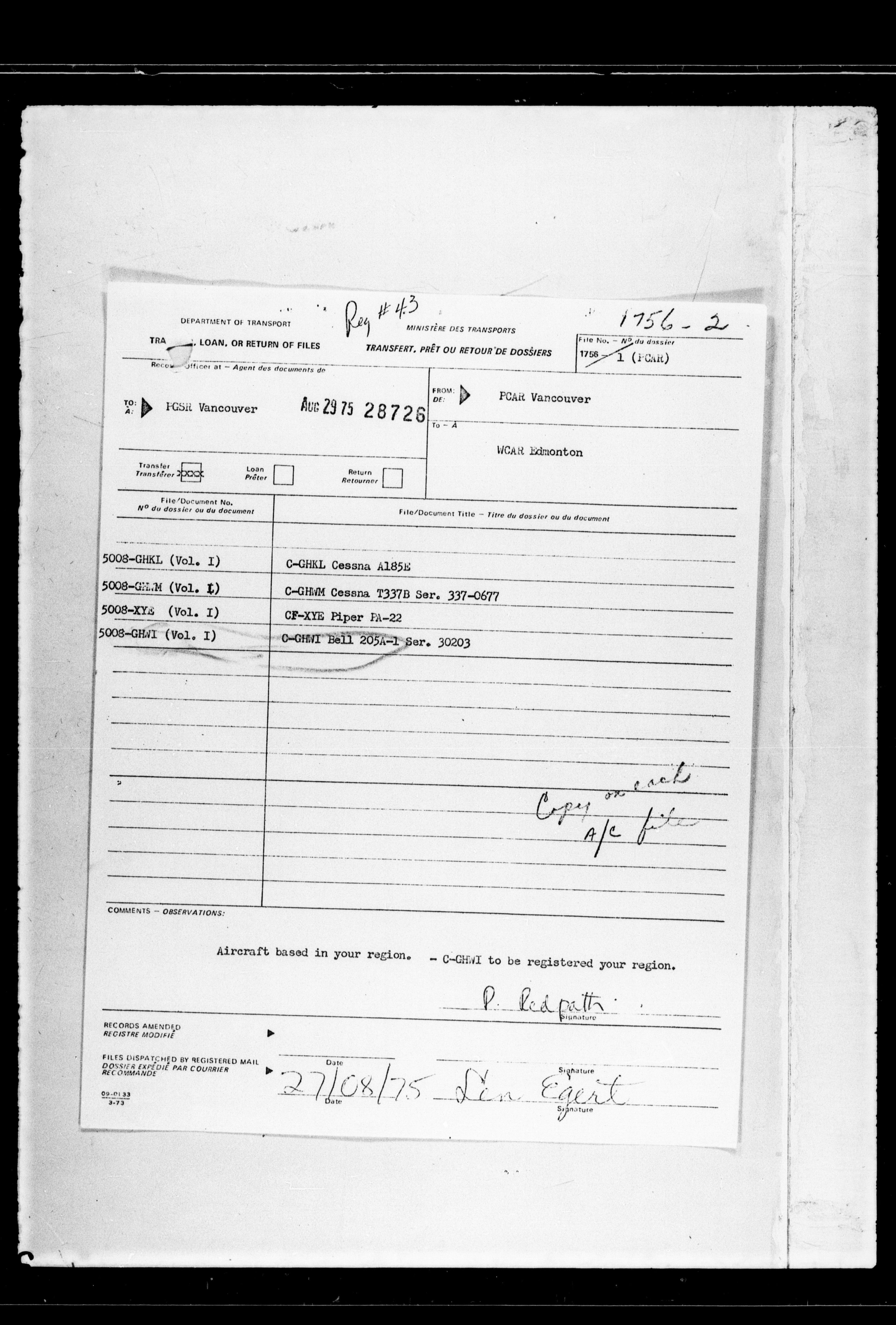 Department of Transport : Civil aircraft registration, inspection and operation files, block 5008, 1920-1986 - 7685