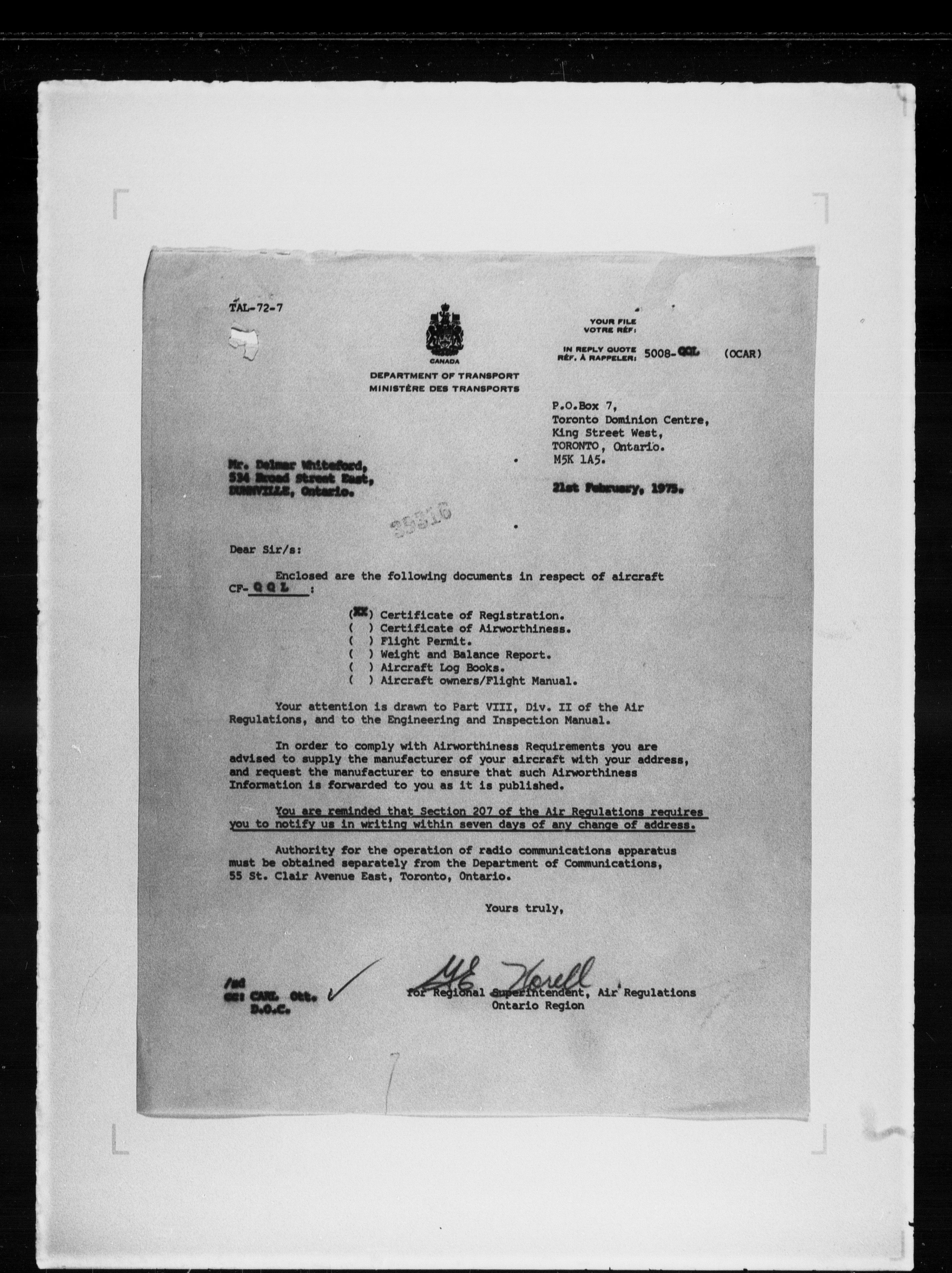 Department of Transport : Civil aircraft registration, inspection and operation files, block 5008, 1920-1986 - 7755