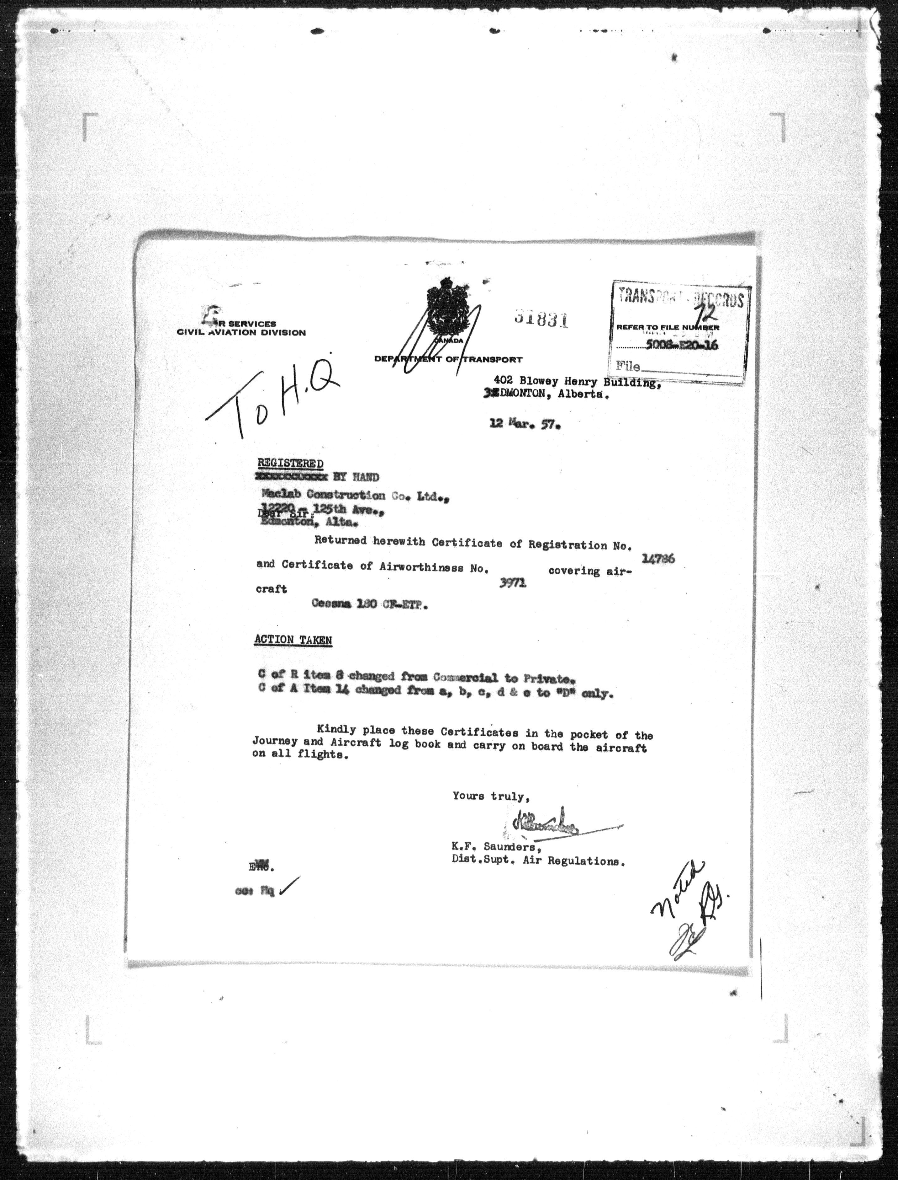 Department of Transport : Civil aircraft registration, inspection and operation files, block 5008, 1920-1986 - 7768