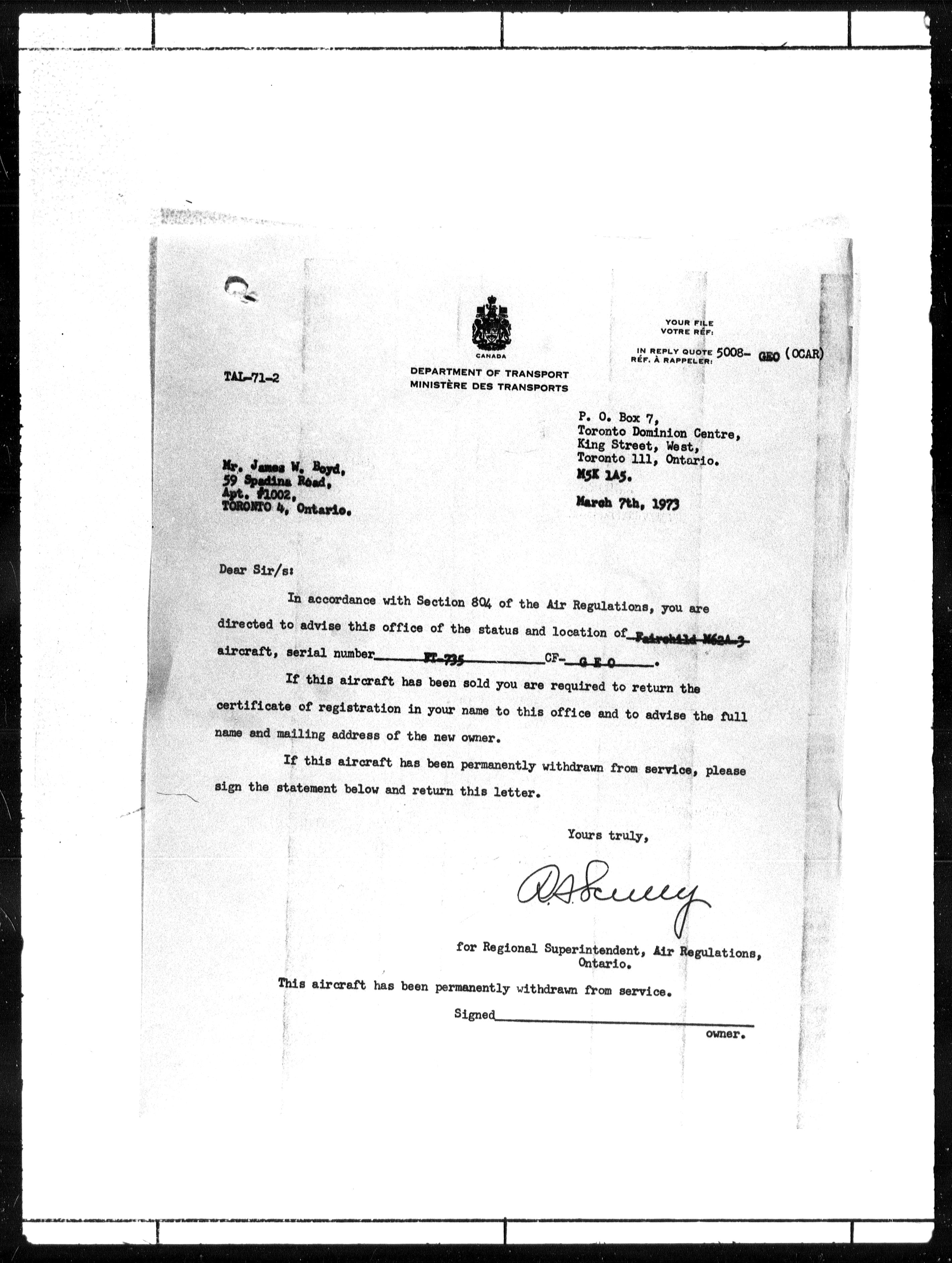 Department of Transport : Civil aircraft registration, inspection and operation files, block 5008, 1920-1986 - 7774