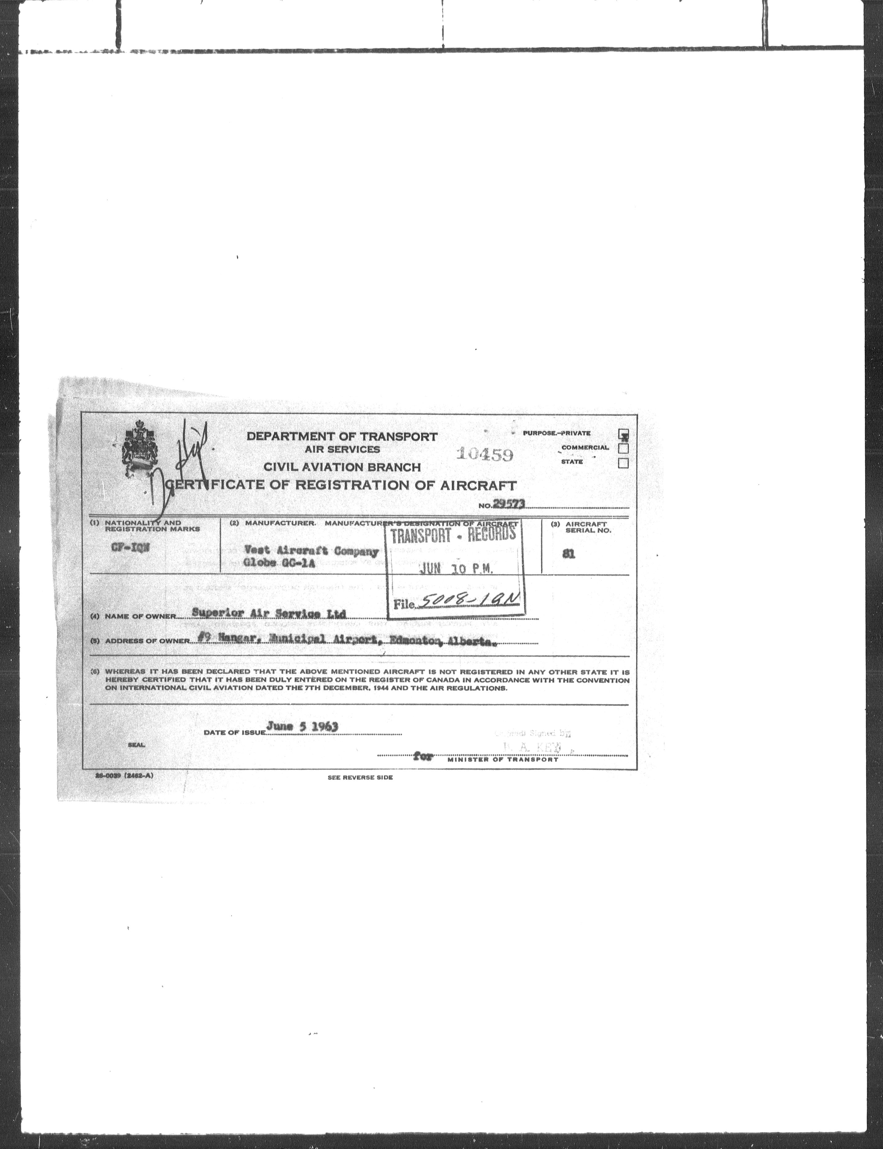 Department of Transport : Civil aircraft registration, inspection and operation files, block 5008, 1920-1986 - 7788