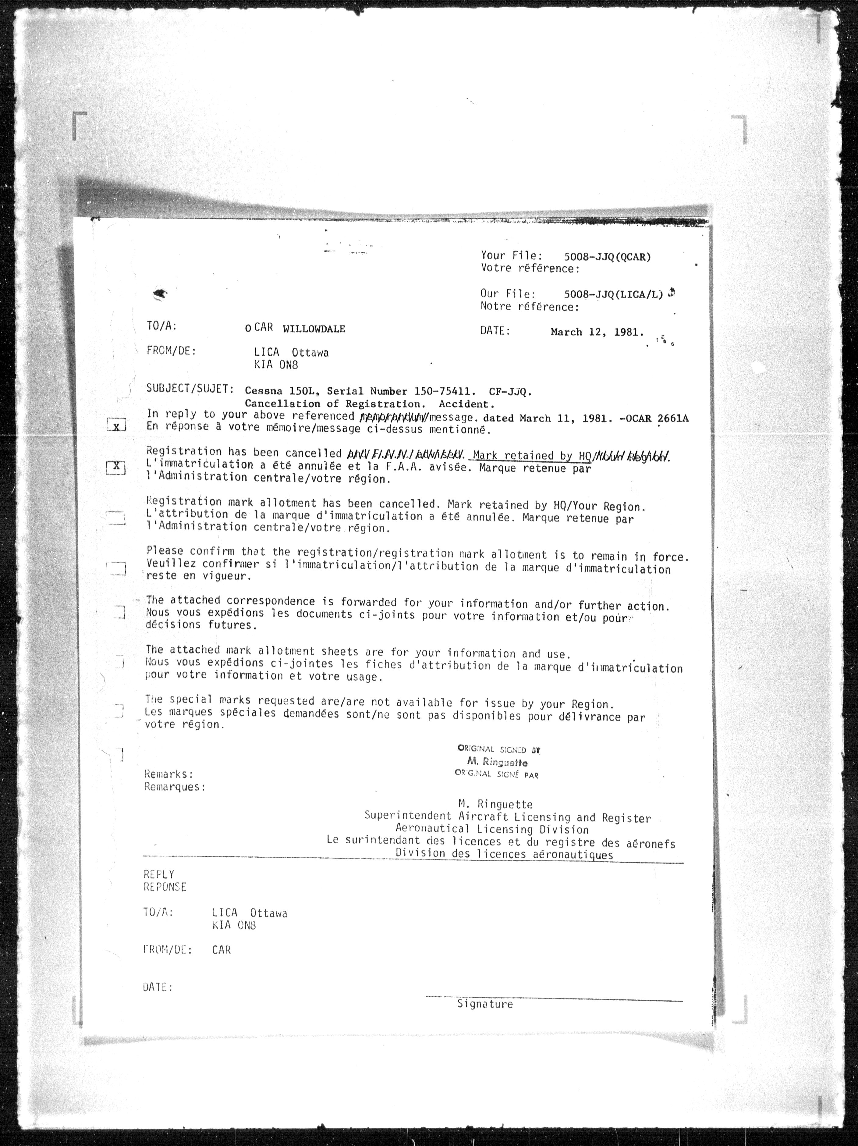 Department of Transport : Civil aircraft registration, inspection and operation files, block 5008, 1920-1986 - 7791