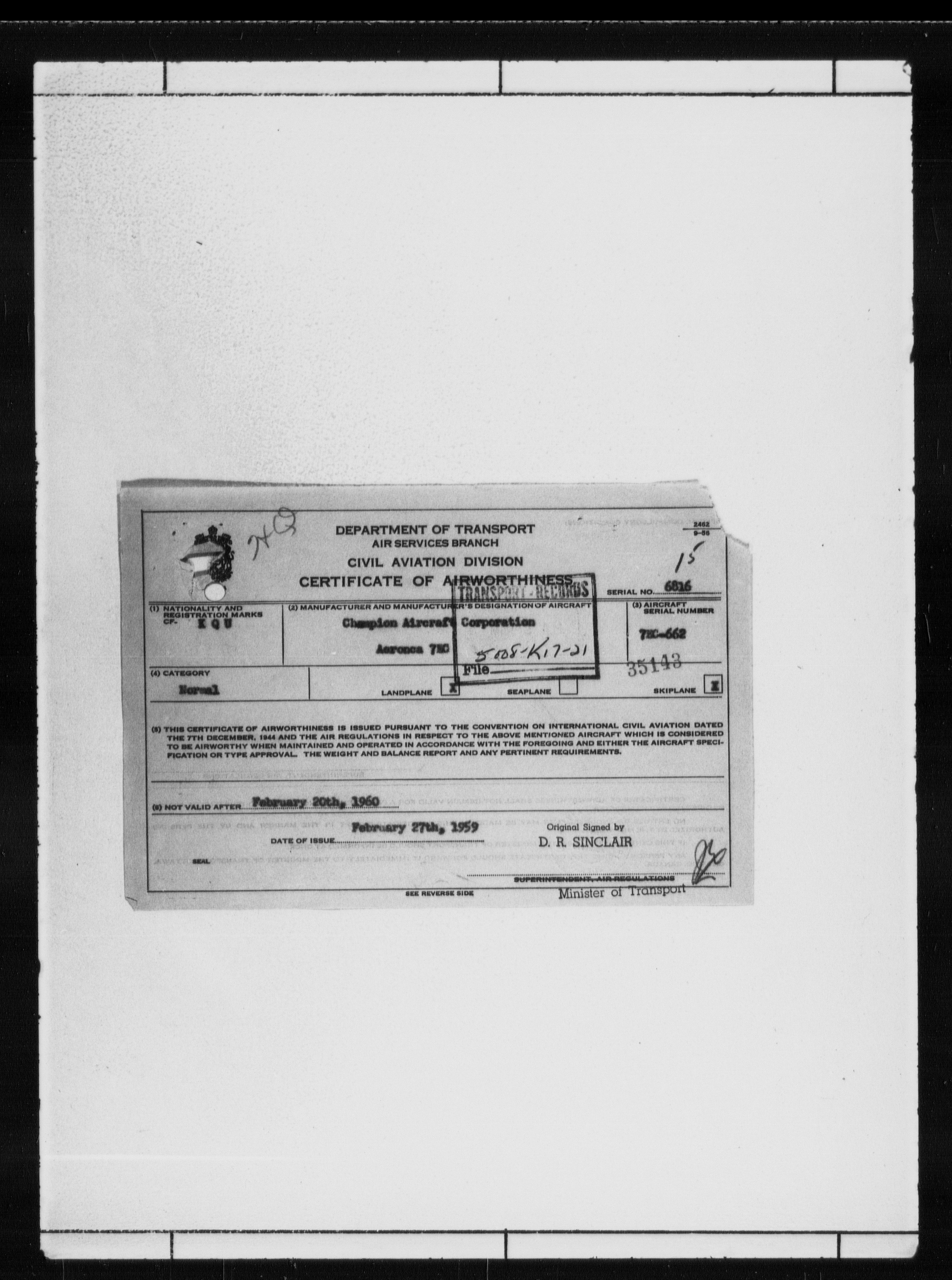 Department of Transport : Civil aircraft registration, inspection and operation files, block 5008, 1920-1986 - 7797