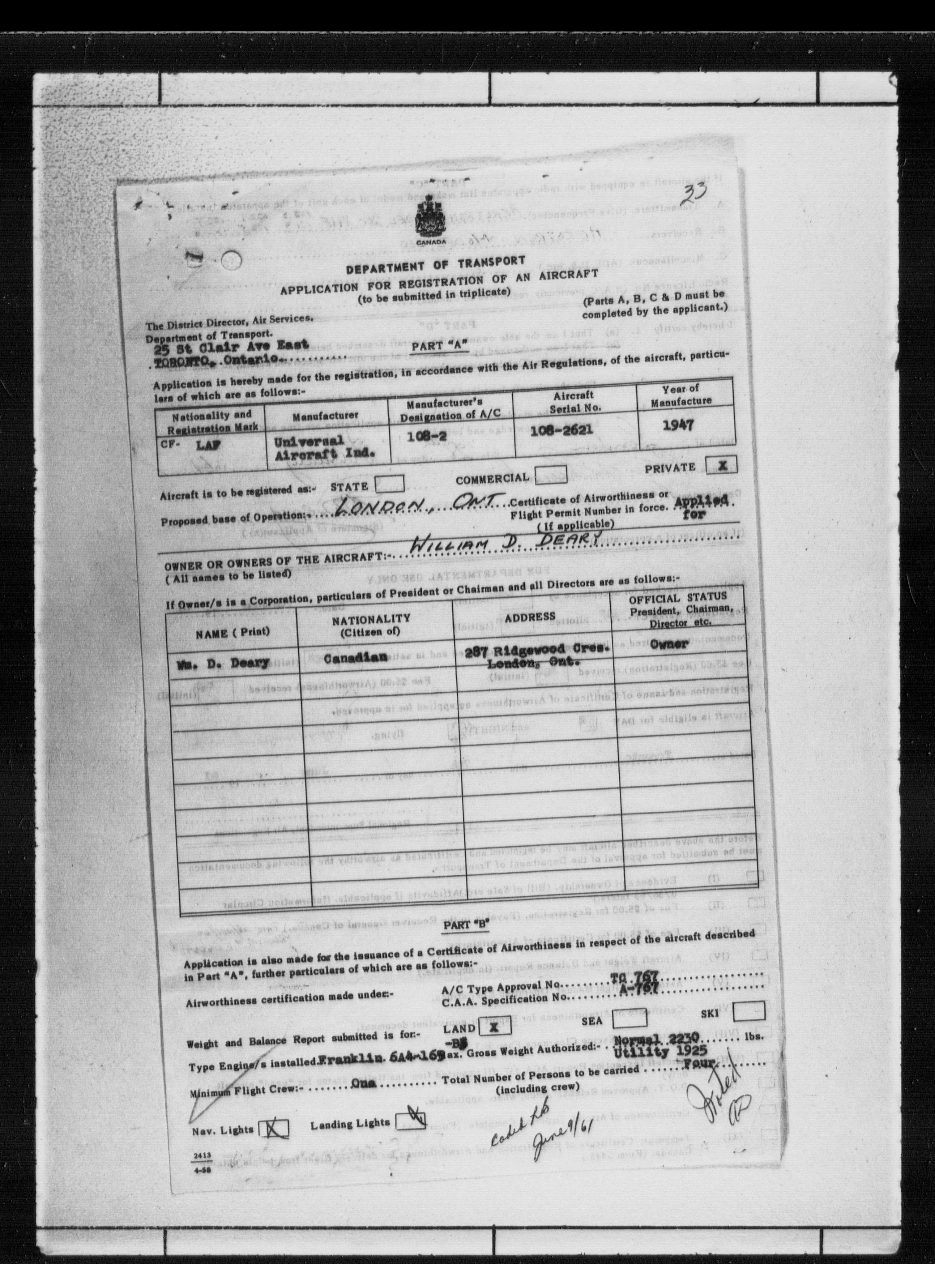 Department of Transport : Civil aircraft registration, inspection and operation files, 1920-1986 : T-7798
