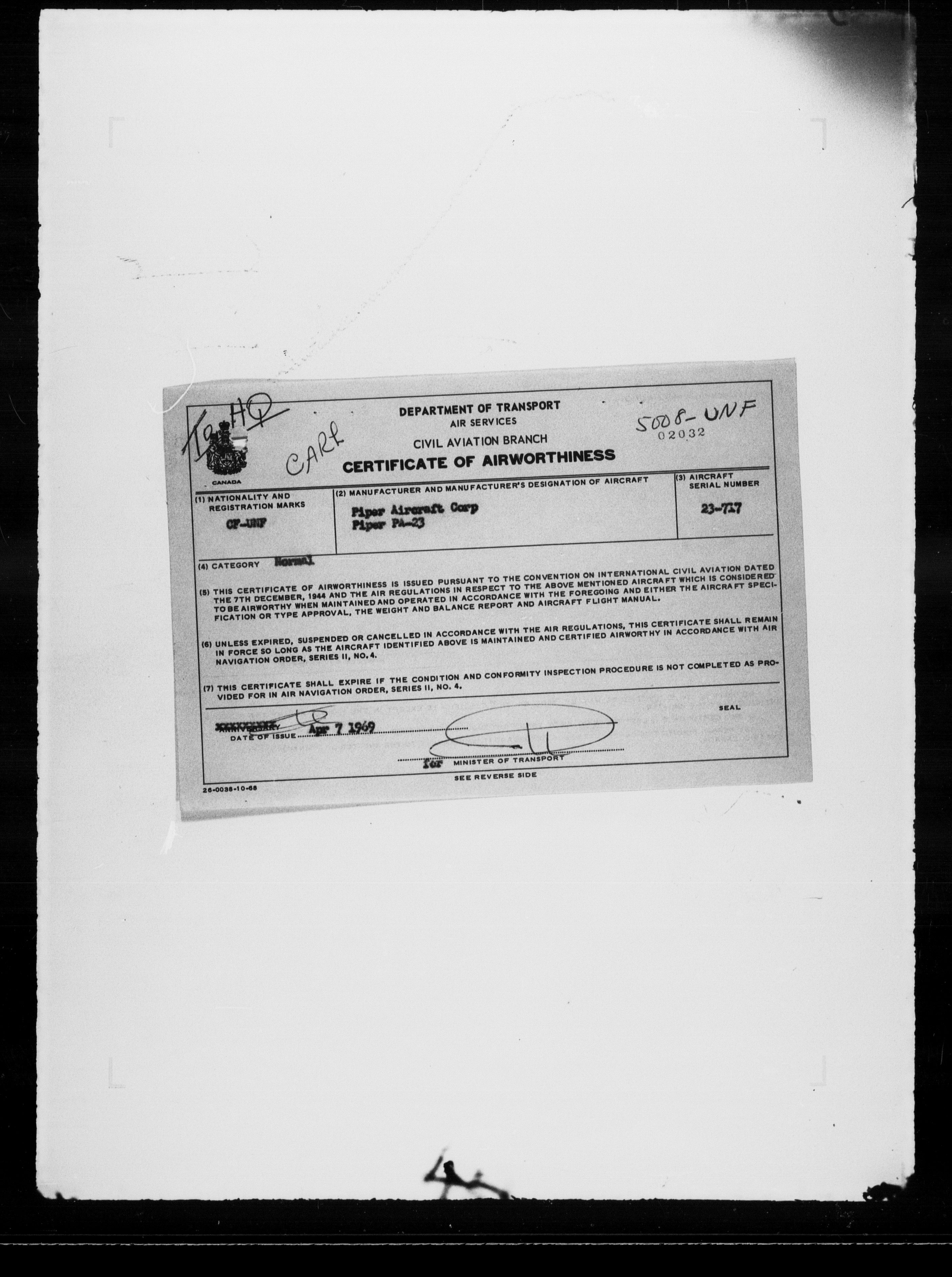 Department of Transport : Civil aircraft registration, inspection and operation files, block 5008, 1920-1986 - 7843