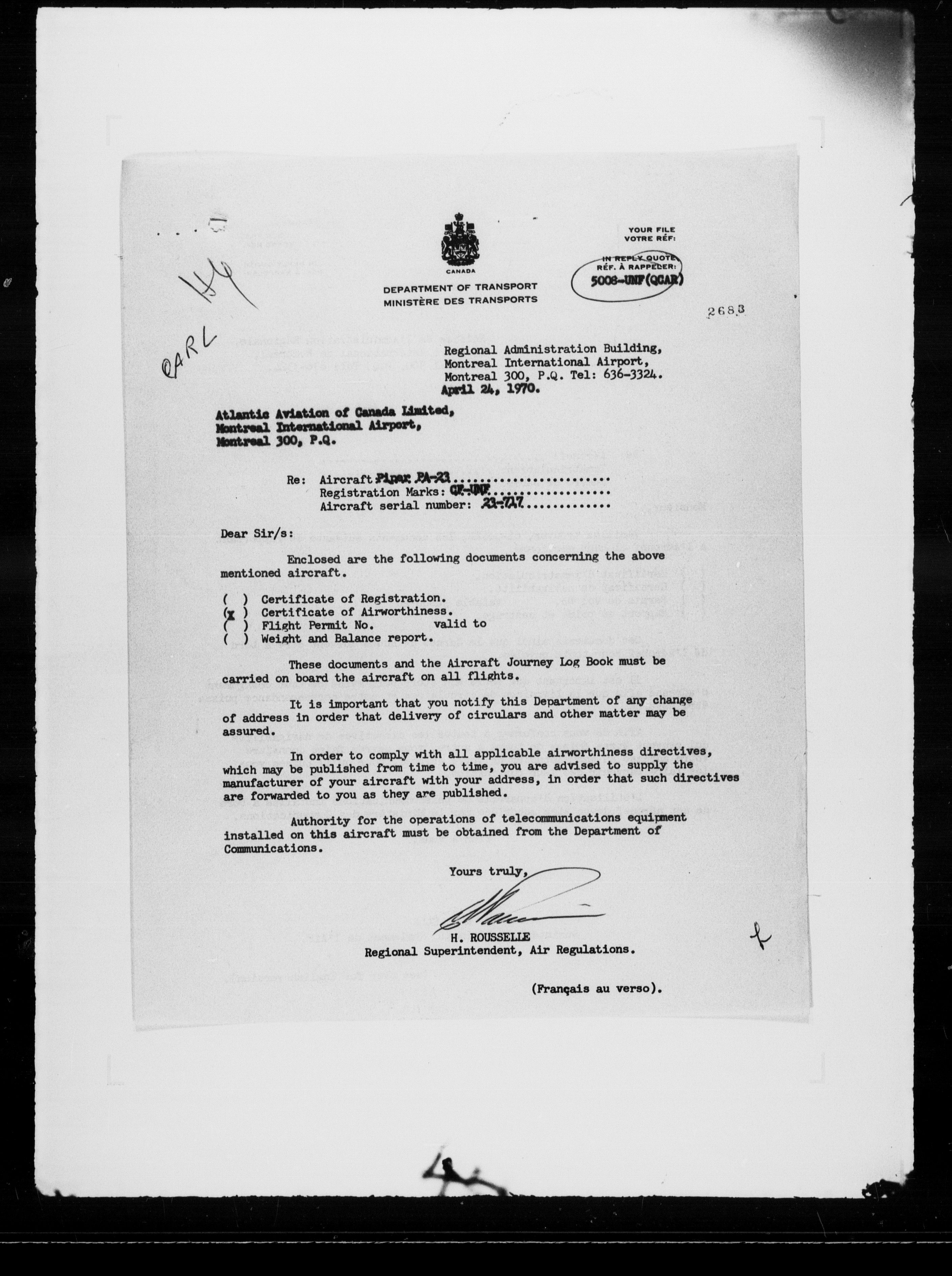 Department of Transport : Civil aircraft registration, inspection and operation files, block 5008, 1920-1986 - 7843