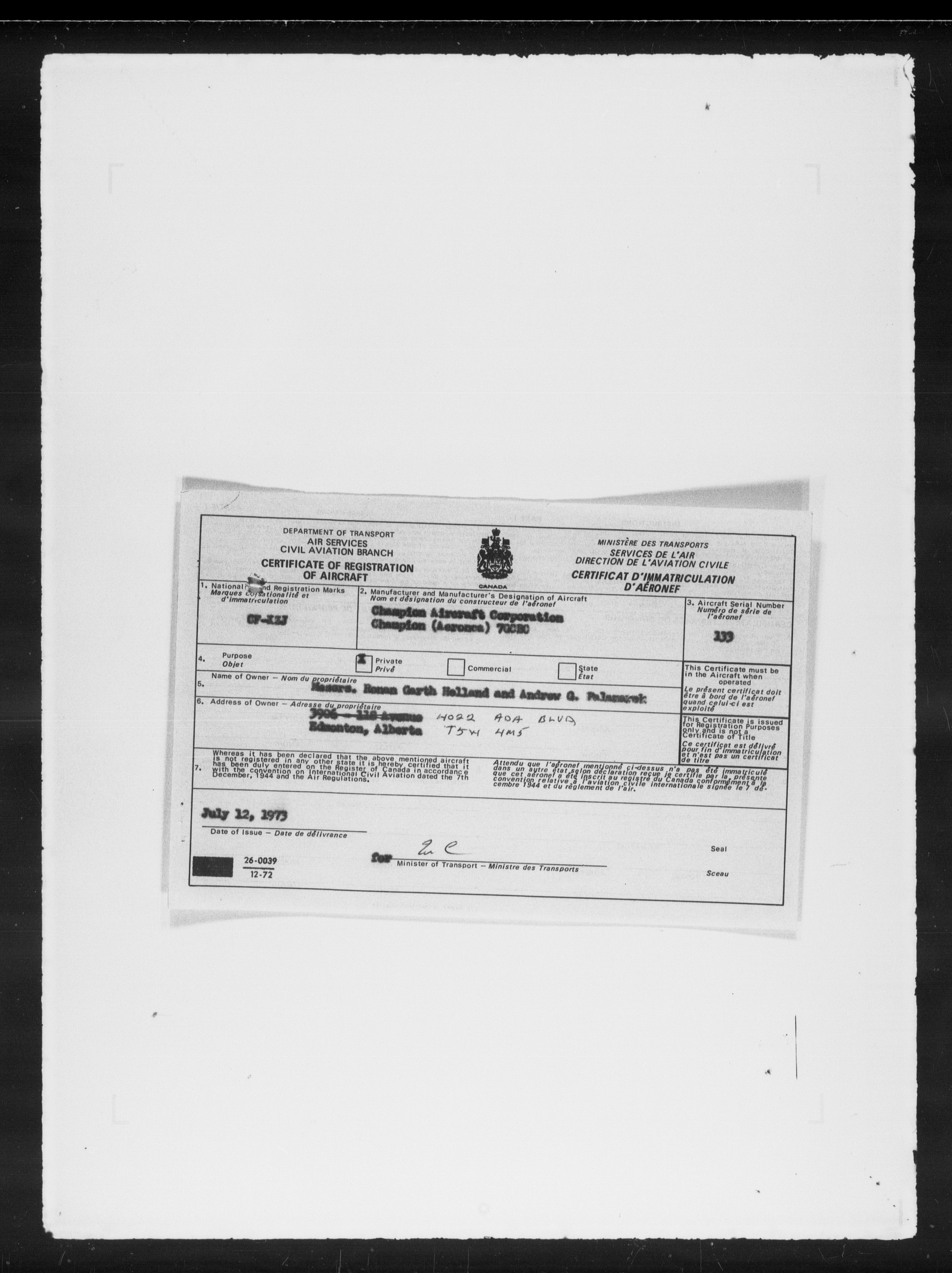Department of Transport : Civil aircraft registration, inspection and operation files, 1920-1986 : T-7857