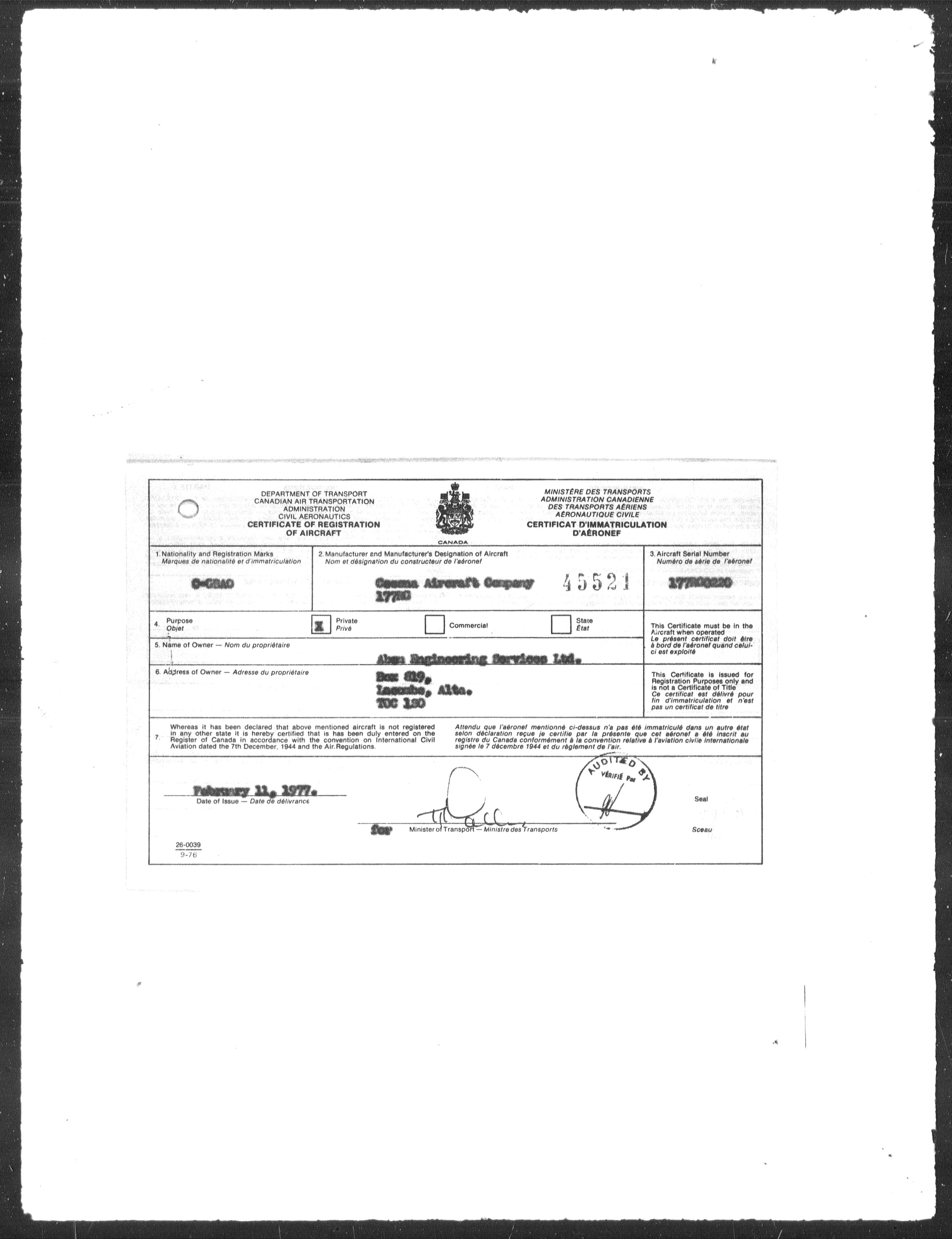 Department of Transport : Civil aircraft registration, inspection and operation files, 1920-1986 : T-7865
