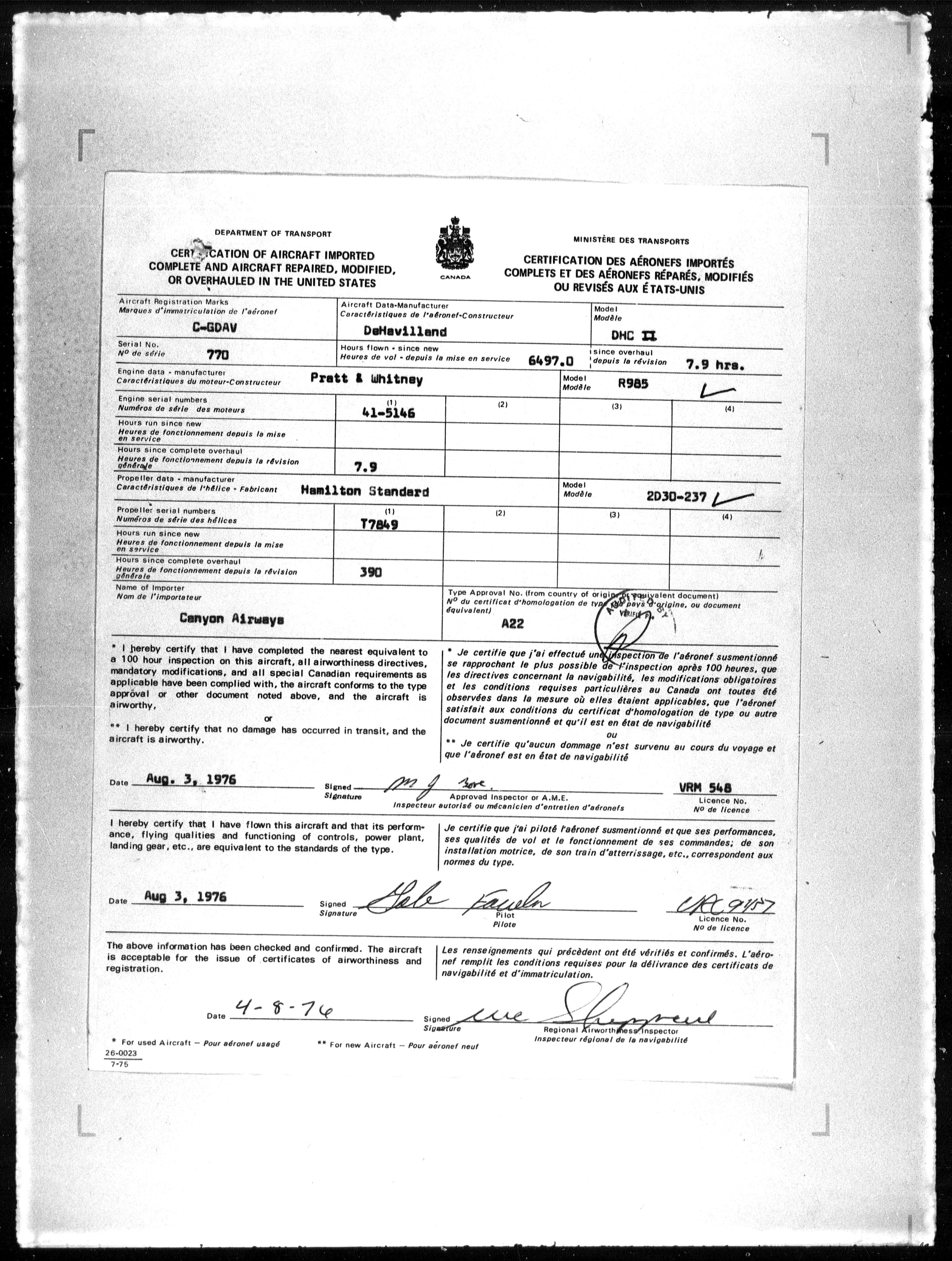 Department of Transport : Civil aircraft registration, inspection and operation files, block 5008, 1920-1986 - 7866