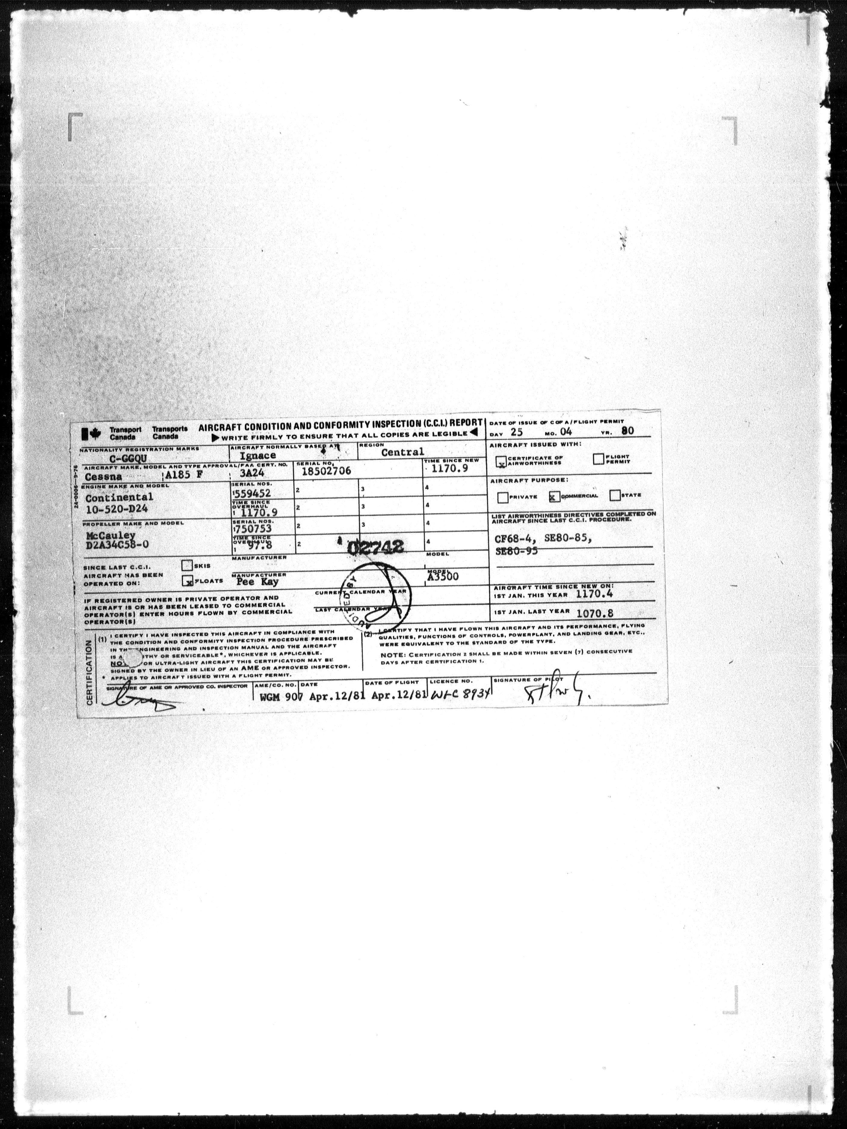 Department of Transport : Civil aircraft registration, inspection and operation files, block 5008, 1920-1986 - 7869