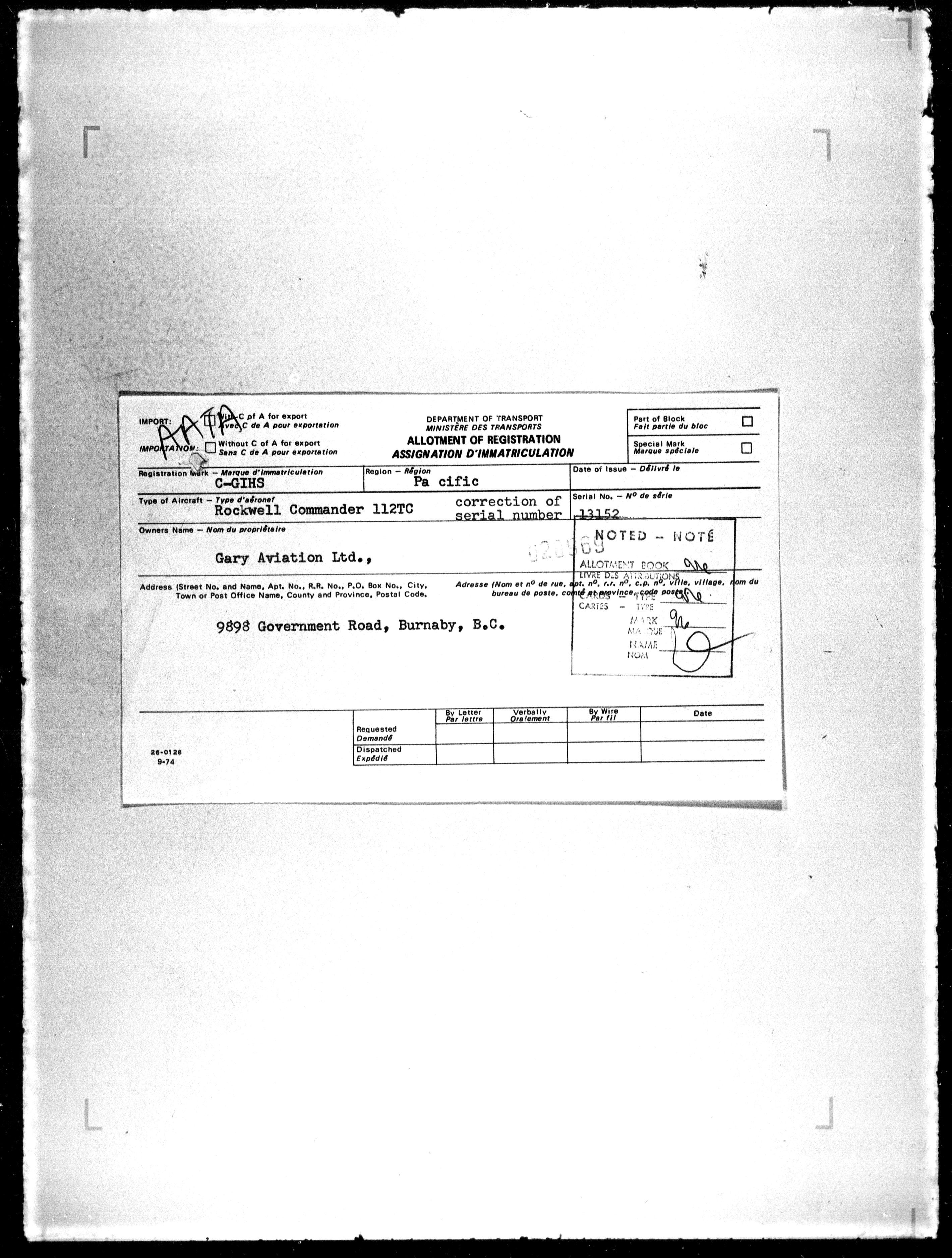 Department of Transport : Civil aircraft registration, inspection and operation files, block 5008, 1920-1986 - 7871