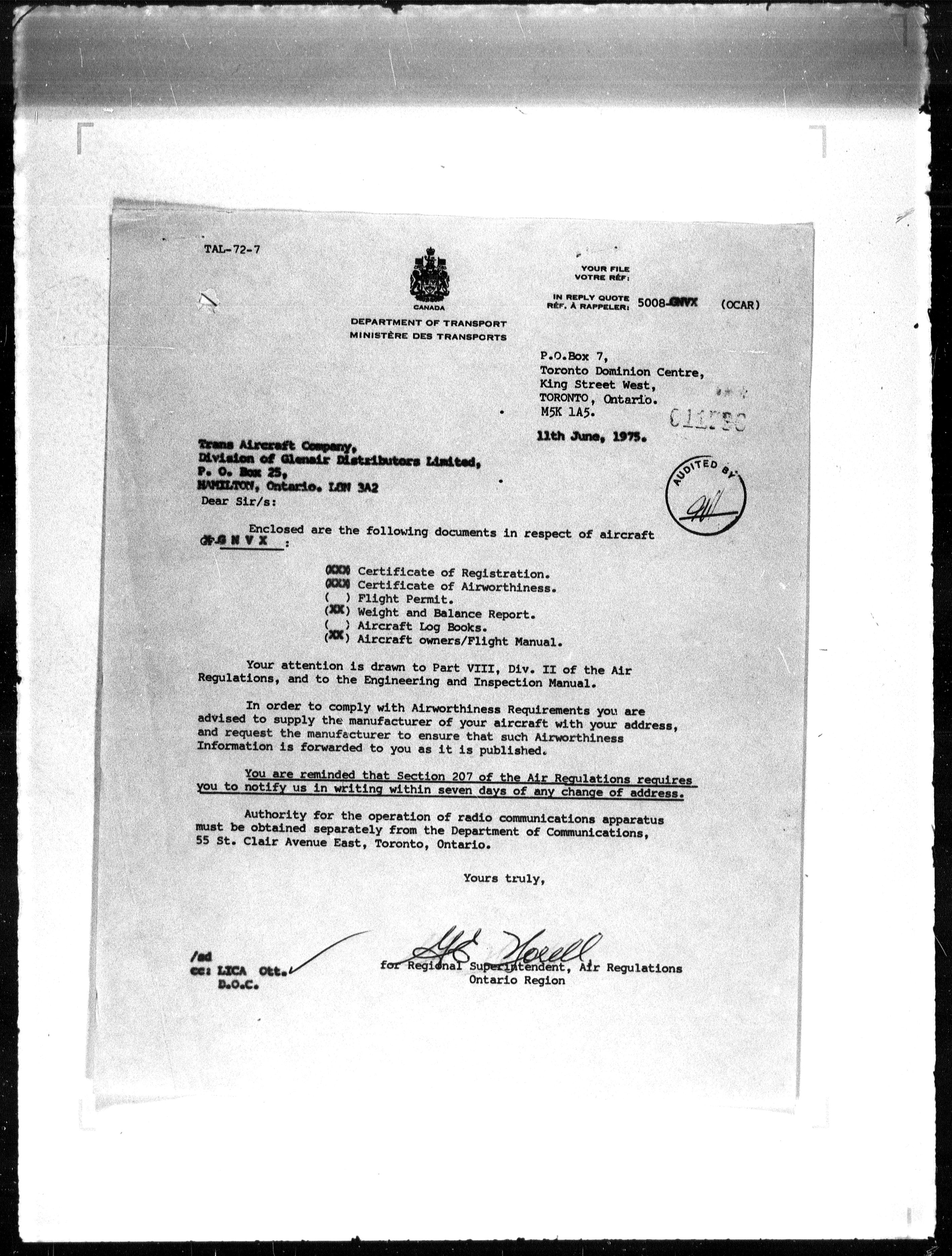 Department of Transport : Civil aircraft registration, inspection and operation files, block 5008, 1920-1986 - 7876