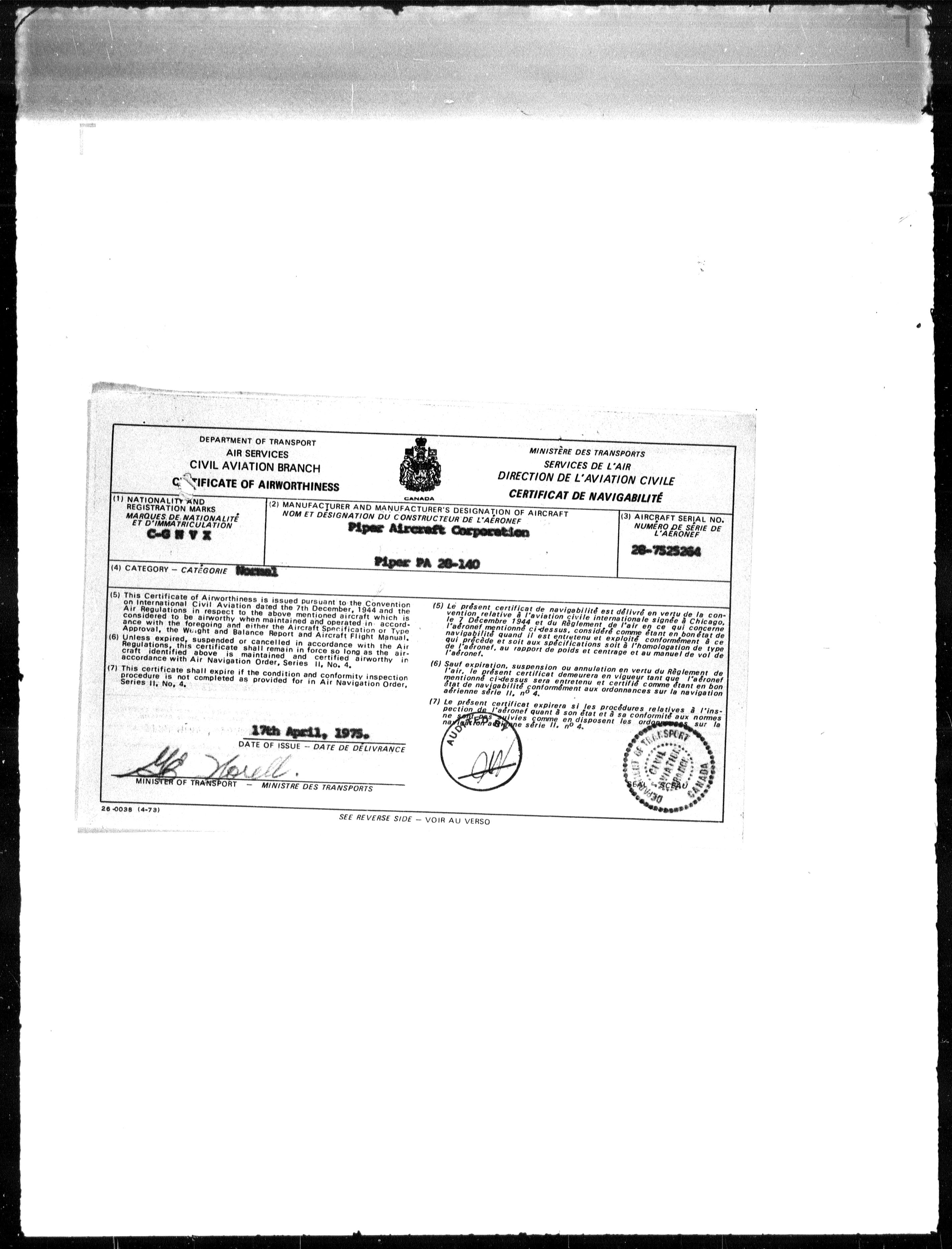 Department of Transport : Civil aircraft registration, inspection and operation files, block 5008, 1920-1986 - 7876