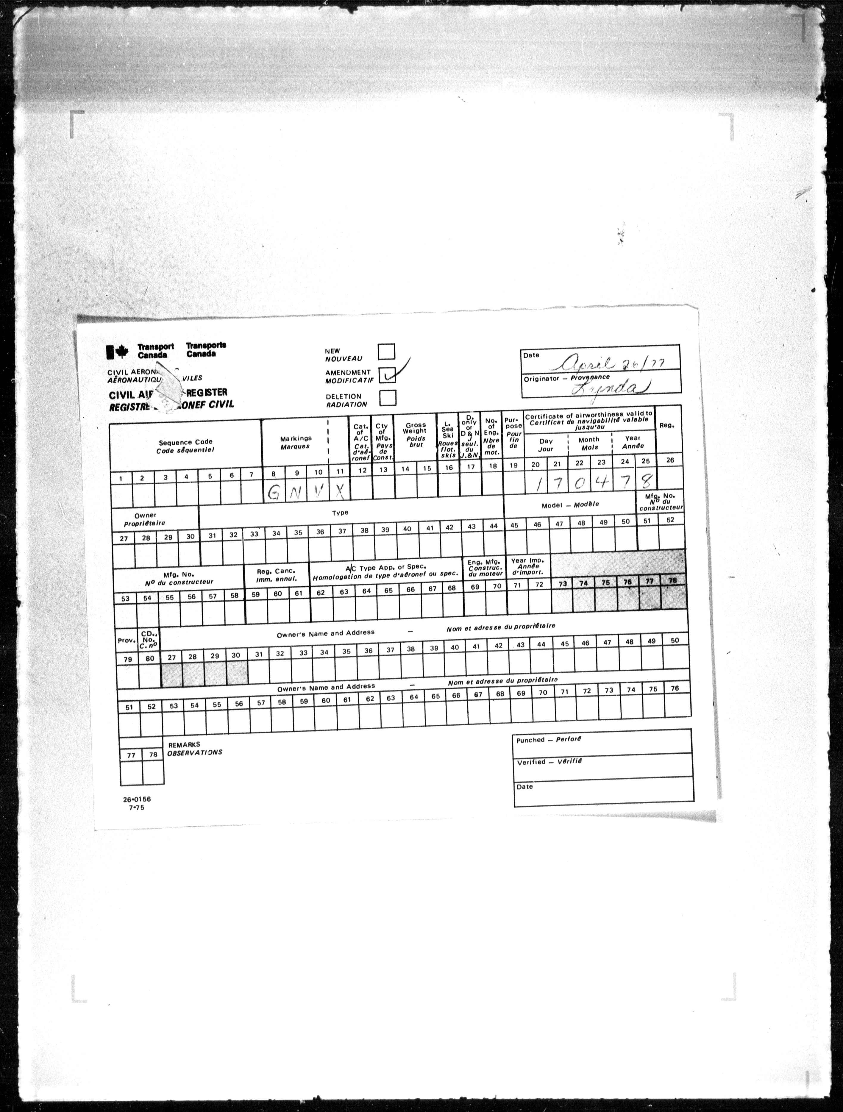 Department of Transport : Civil aircraft registration, inspection and operation files, block 5008, 1920-1986 - 7876