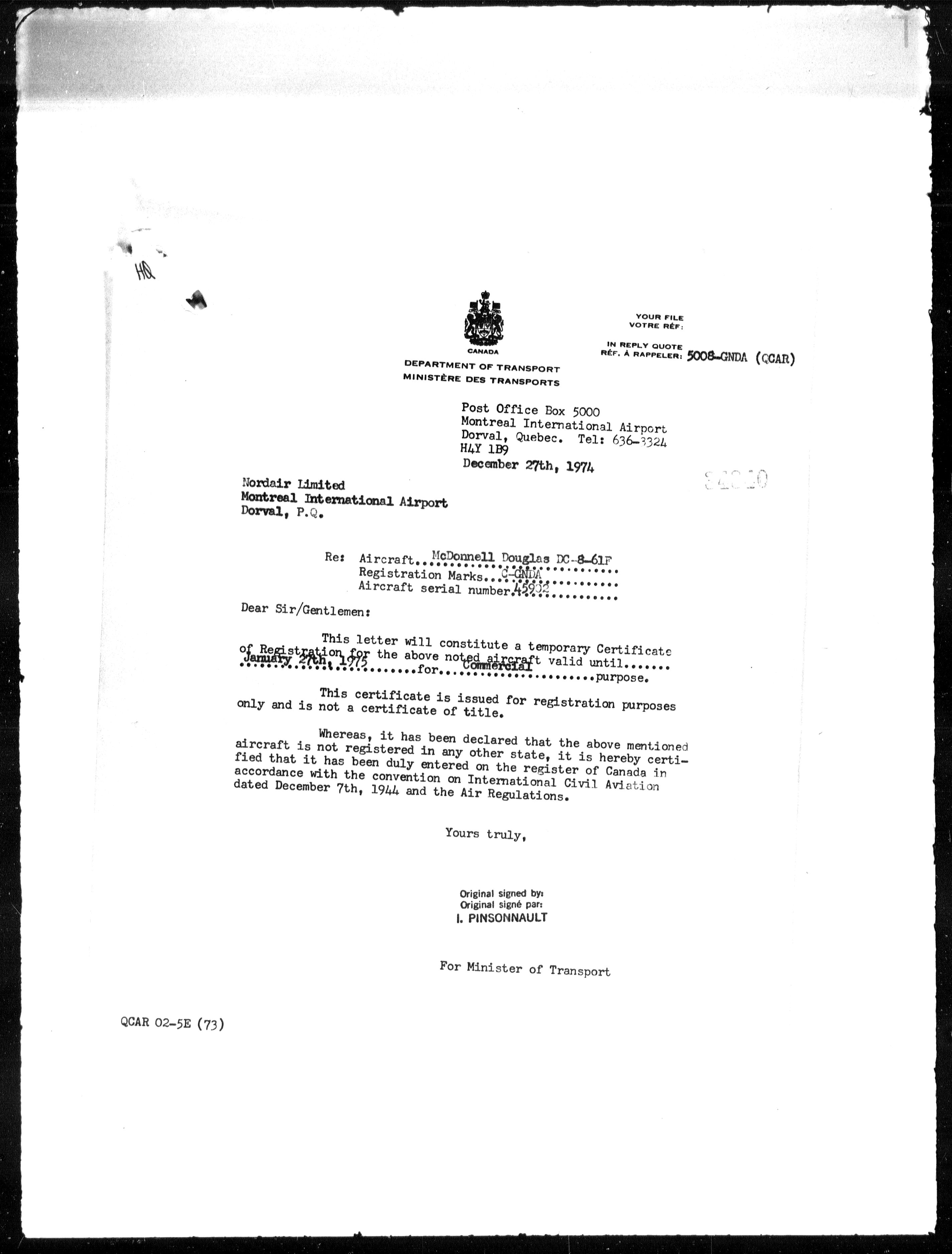 Department of Transport : Civil aircraft registration, inspection and operation files, block 5008, 1920-1986 - 7876