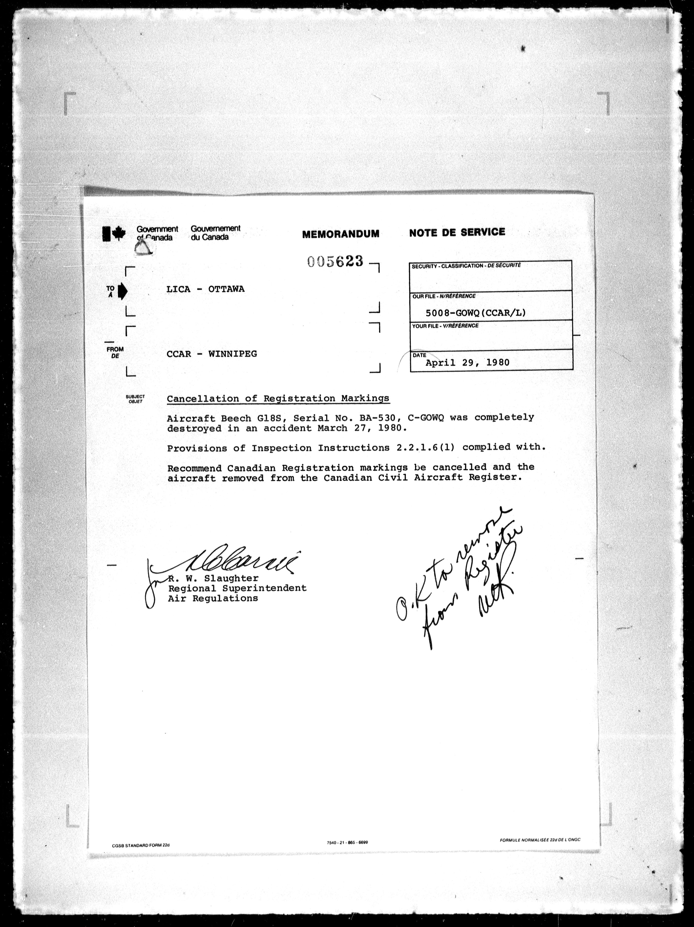 Department of Transport : Civil aircraft registration, inspection and operation files, block 5008, 1920-1986 - 7878