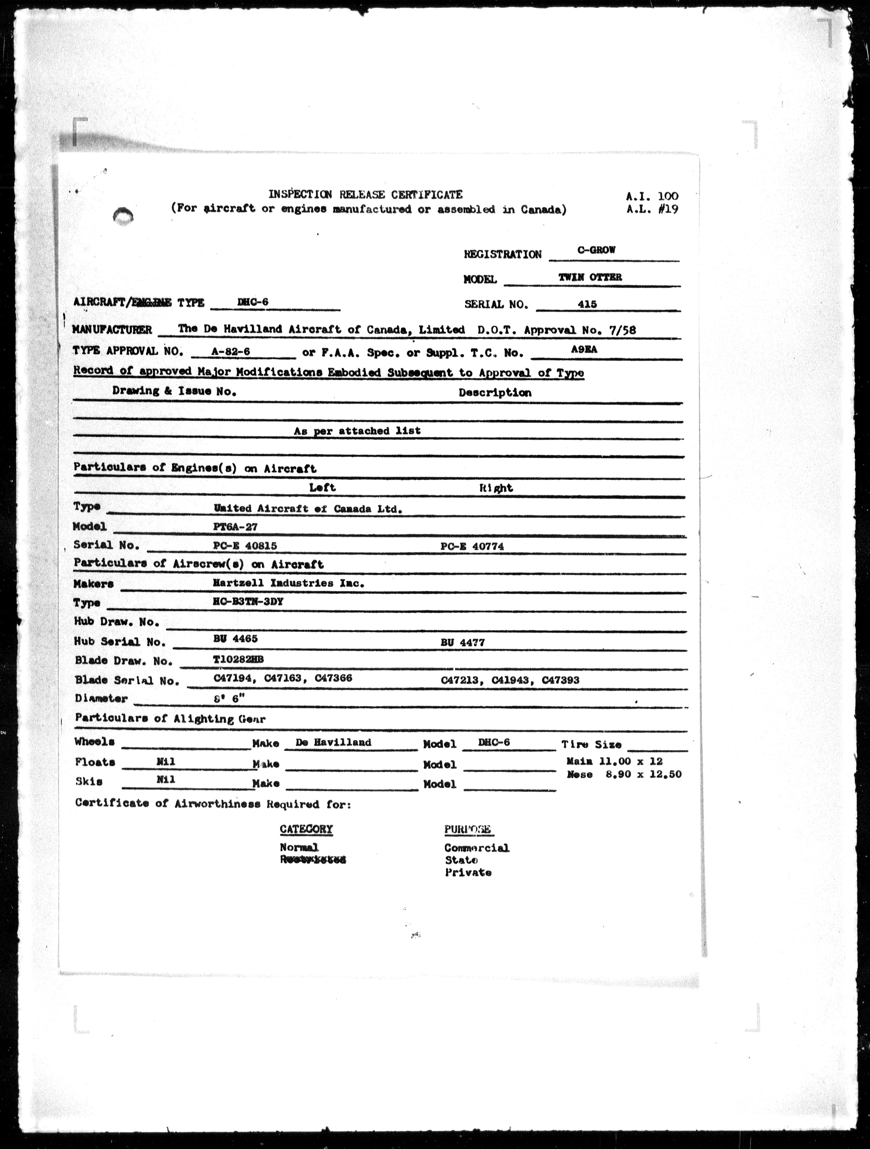 Department of Transport : Civil aircraft registration, inspection and operation files, 1920-1986 : T-7880